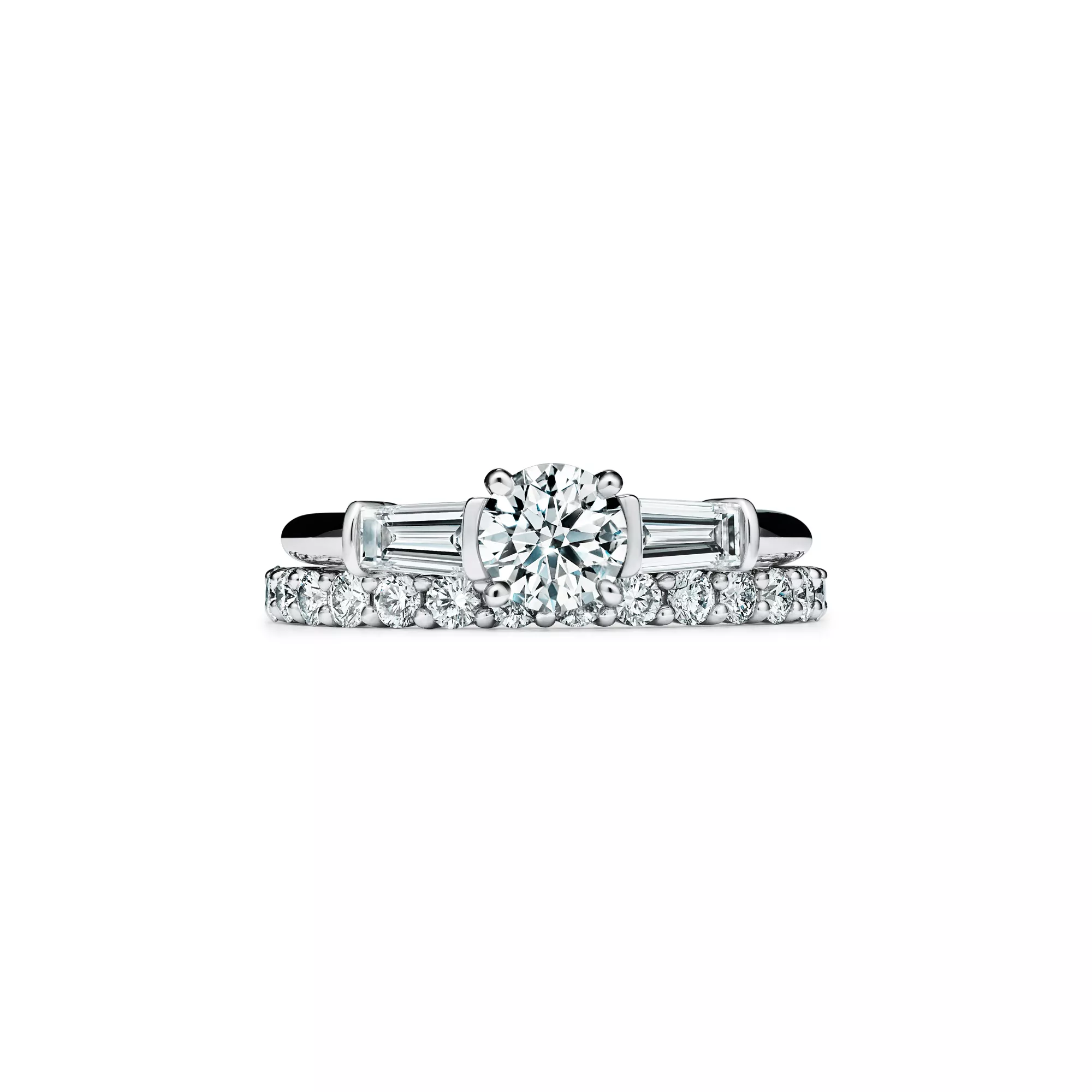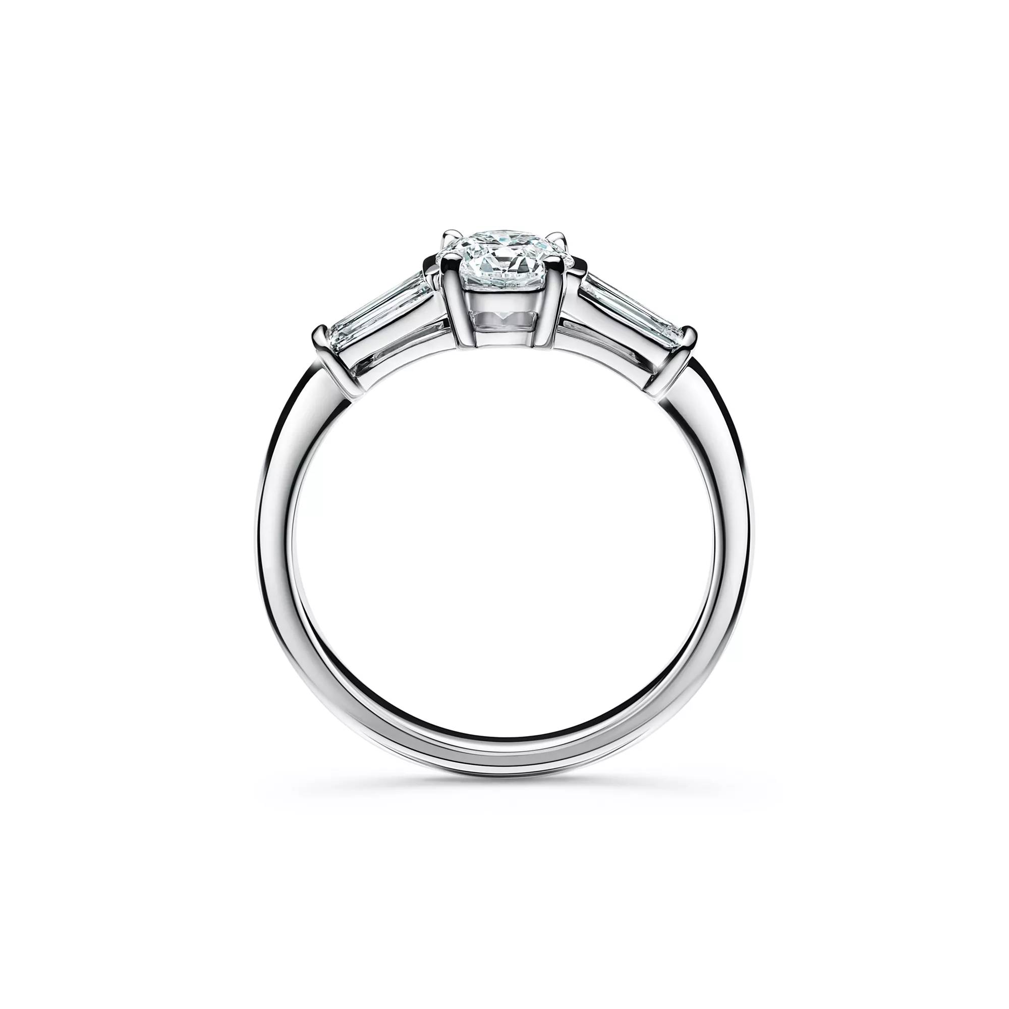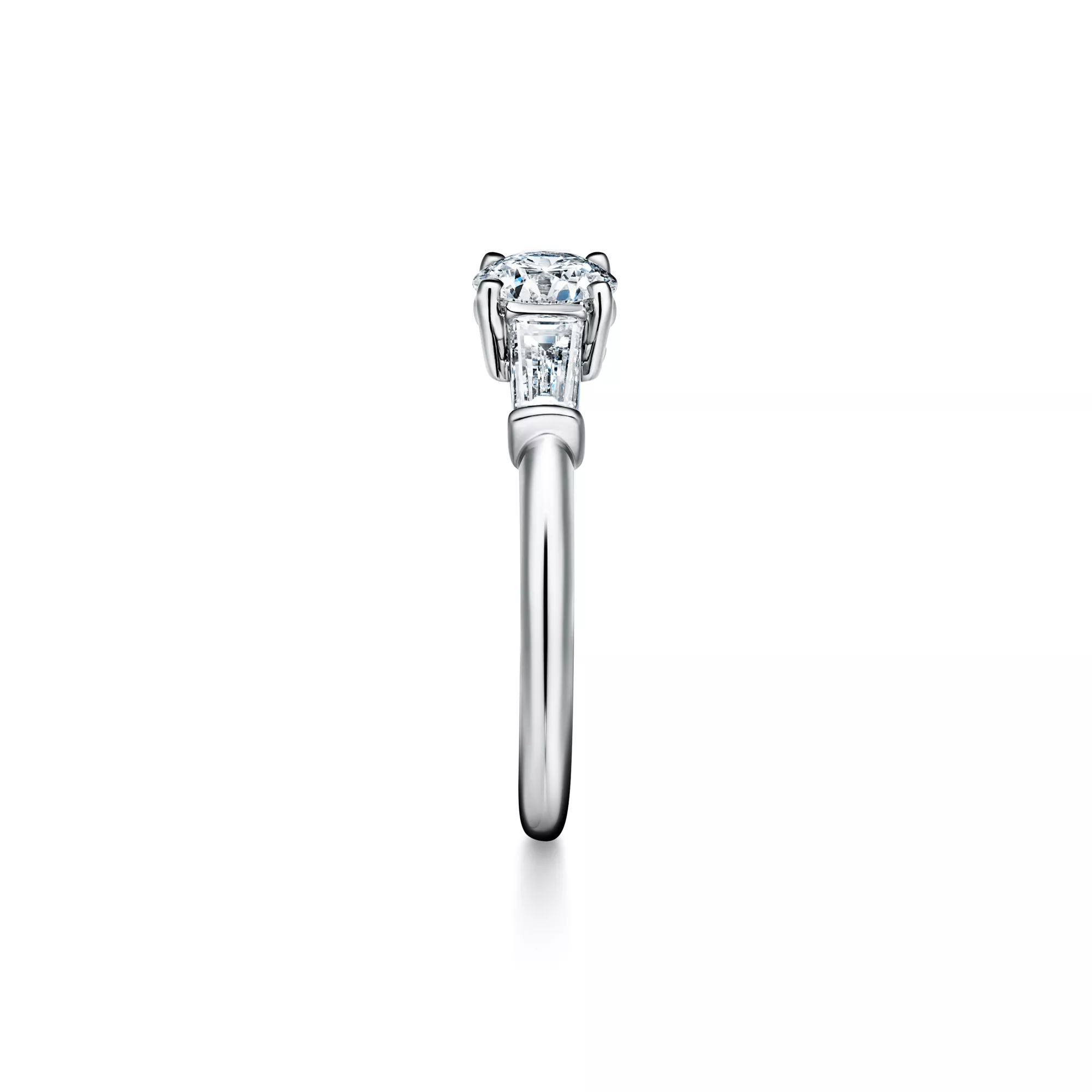 El anillo de compromiso Tiffany Three Stone es una muestra de belleza atemporal y exhaustiva atención al detalle gracias a los dos diamantes de talla baguette estrecha tallados con precisión para engarzar junto a una clásica gema central redonda brillante. Las dos gemas laterales con talla baguette estrecha, seleccionadas a mano por los artesanos de Tiffany con el fin de sacar a la luz un brillo y una luminosidad intensos en la gema central, presentan un grado de color que es igual que o un grado inferior al del diamante central.