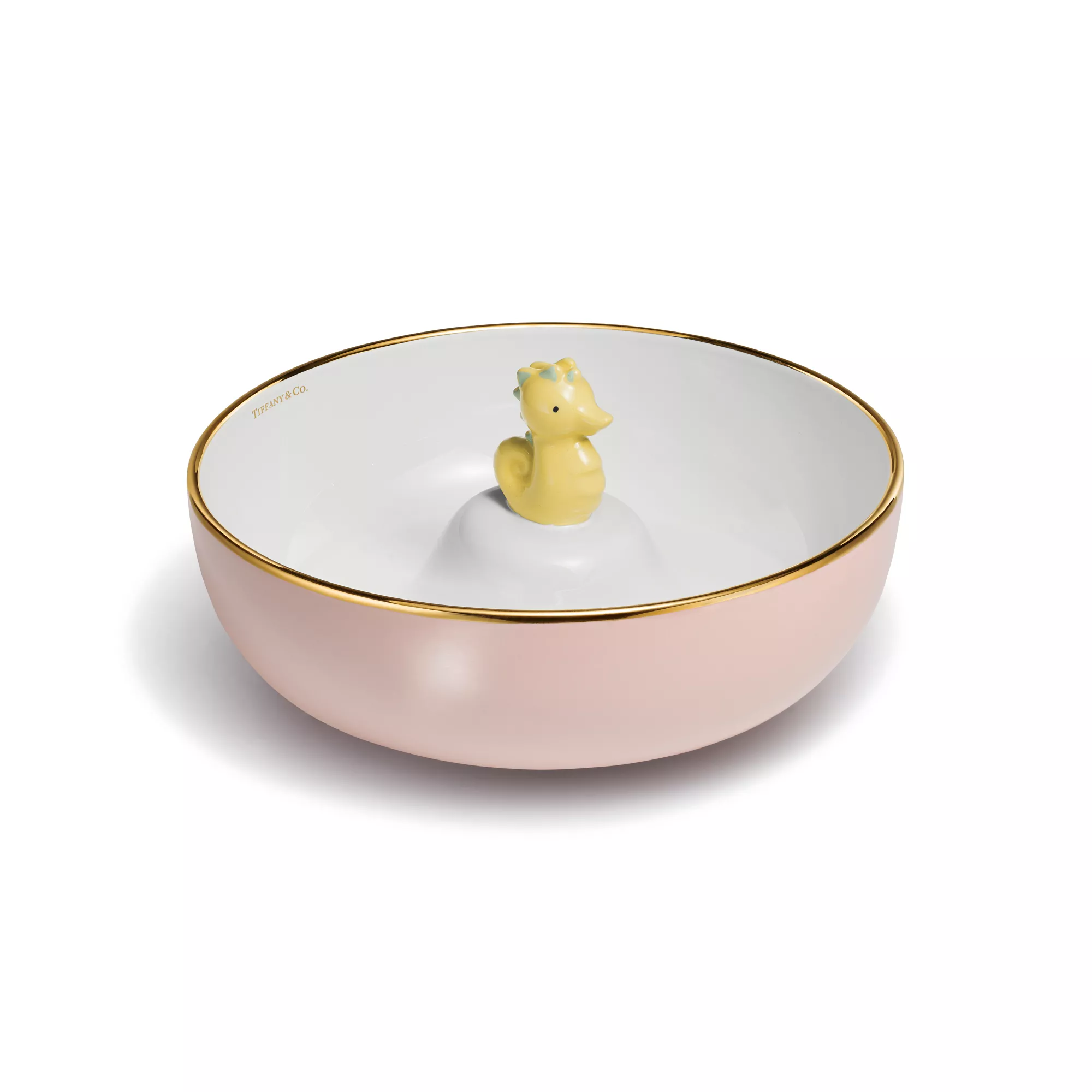 Para los diseños bonitos nunca se es demasiado joven. Nuestra colección Tiny Tiffany celebra los logros de los más pequeños con objetos que rinden homenaje a los icónicos detalles y joyas de la marca. Este cuenco está decorado con nuestro caballito de mar Citrino, un personaje inspirado en el inquebrantable amor de Tiffany por la naturaleza, que hará volar la imaginación de los más pequeños.