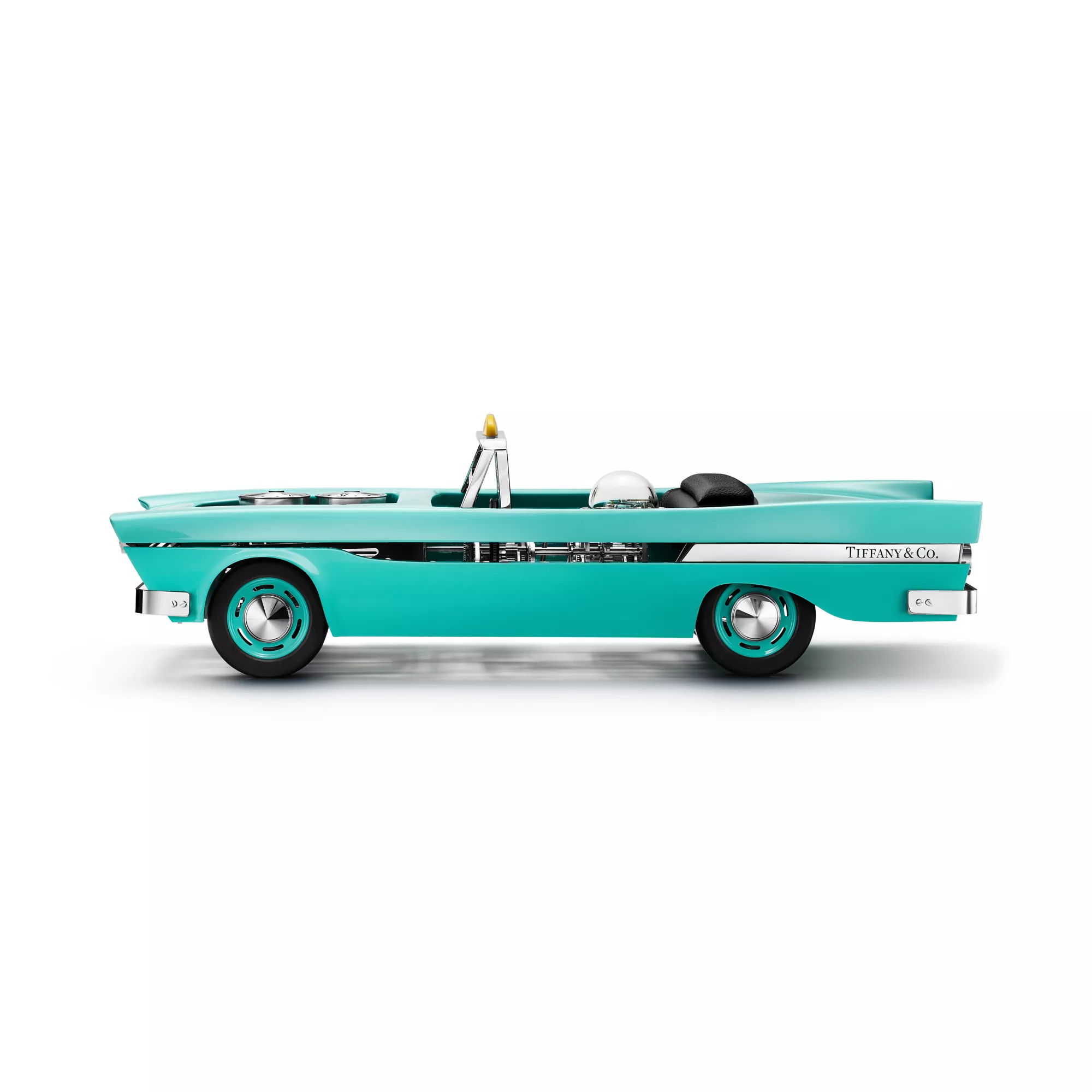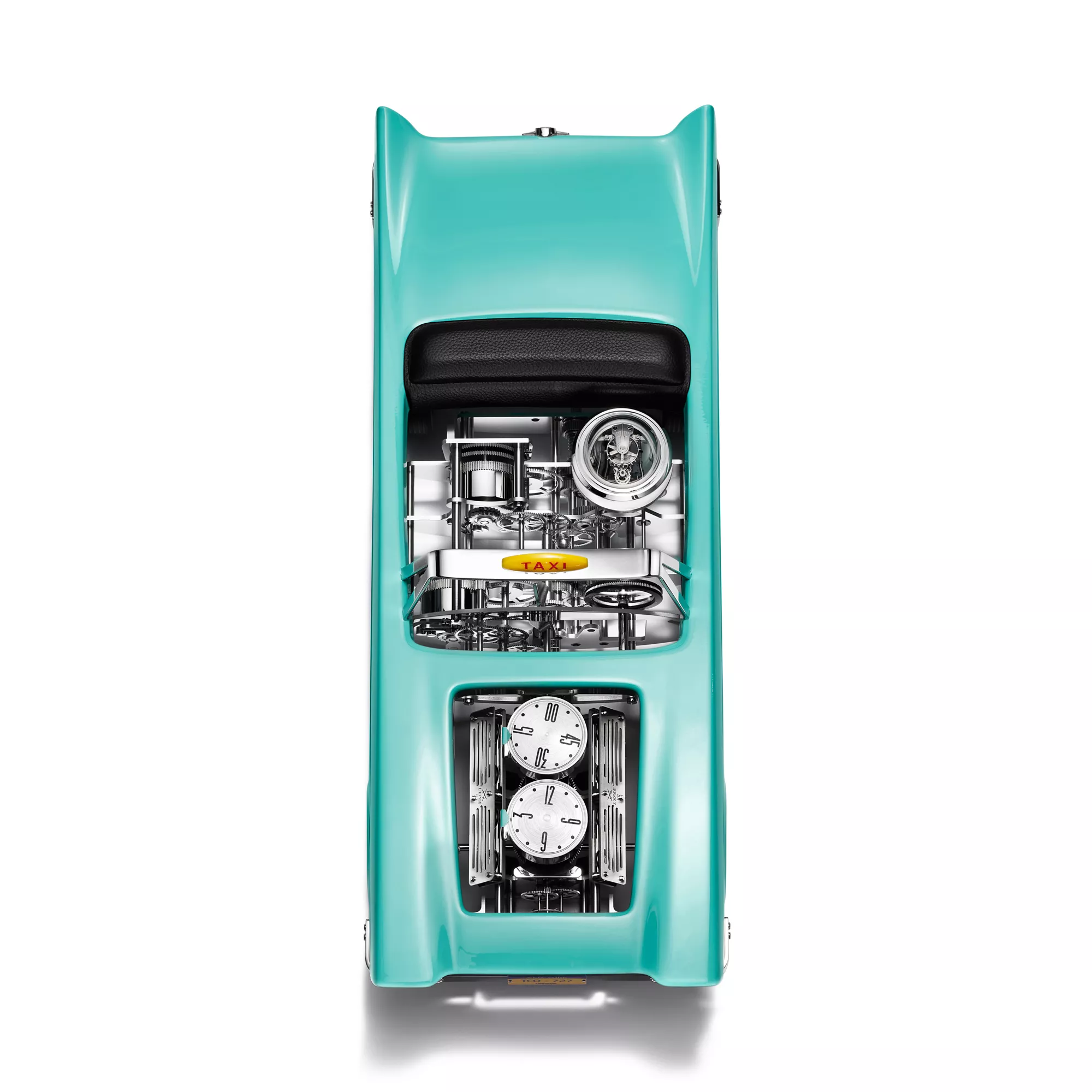El reloj Tiffany Taxi está inspirado en los taxis de Nueva York típicos de la década de 1950. Este original diseño, elaborado a mano con aluminio, lleva un guardabarros trasero estilo años 50 y la señal de taxi amarilla sobre el parabrisas. El reloj lleva dos mecanismos: uno para dar la hora y otro para mantenerse en funcionamiento. Las horas y los minutos se muestran en discos giratorios de acero inoxidable, situados sobre unas columnas que recuerdan a los filtros de aire del motor.