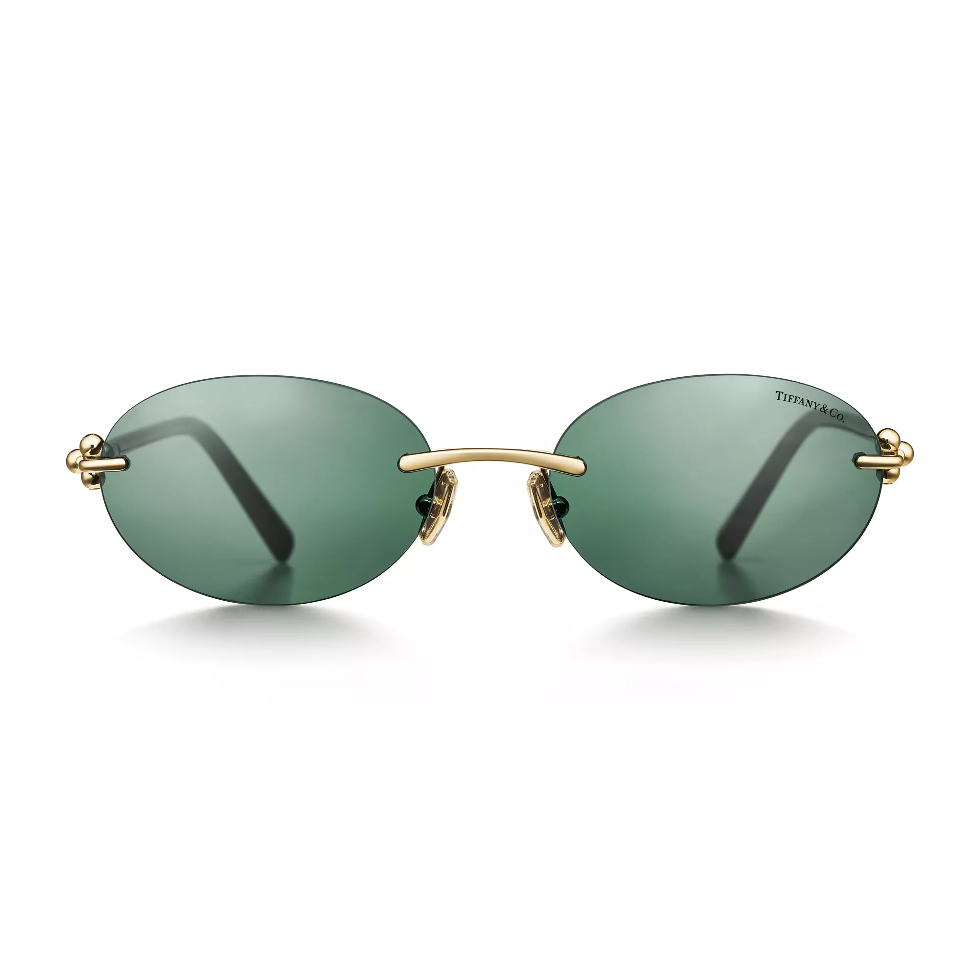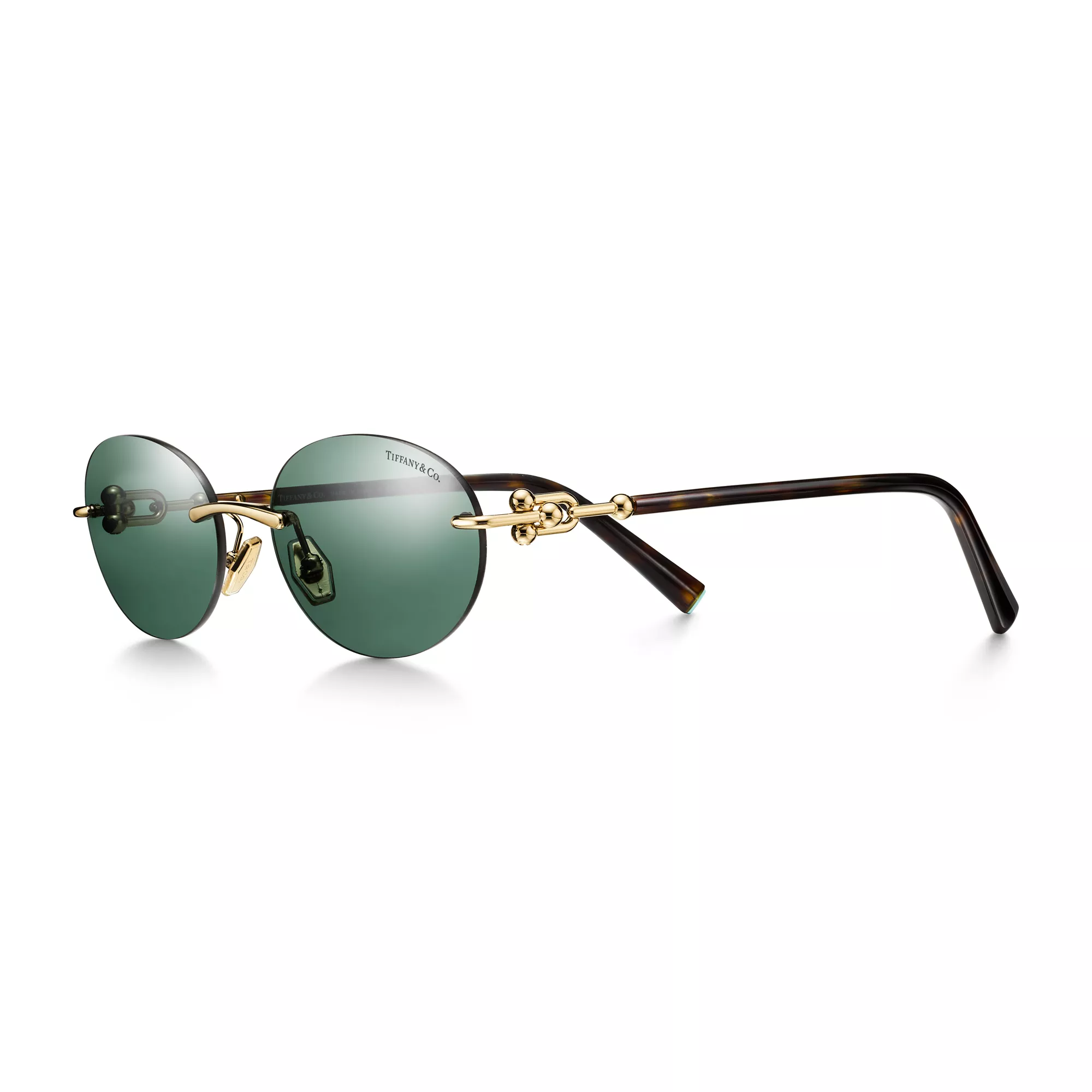 Tiffany HardWear se inspira en la actitud y la energía de la ciudad de Nueva York. Basadas en los códigos de diseño que definen la colección de joyería, estas gafas de sol cuentan con los emblemáticos eslabones anchos a modo de bisagras en las patillas. Las monturas están diseñadas en metal dorado claro con cristales ovalados color verde oscuro.