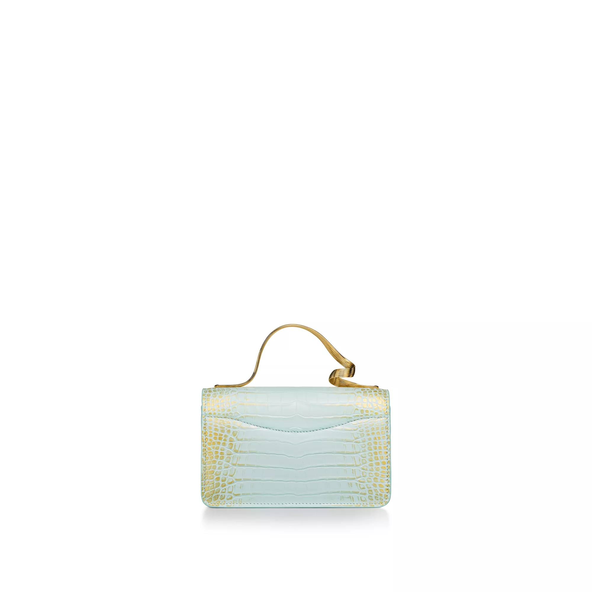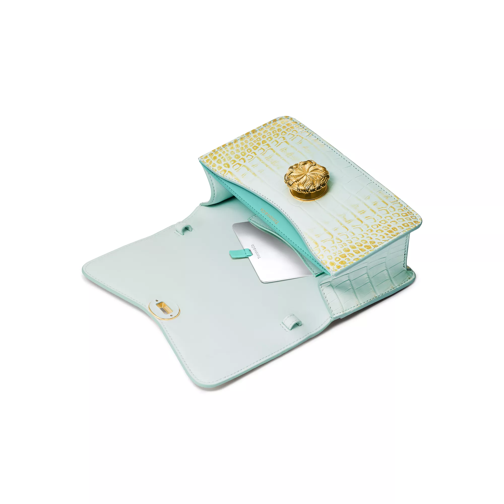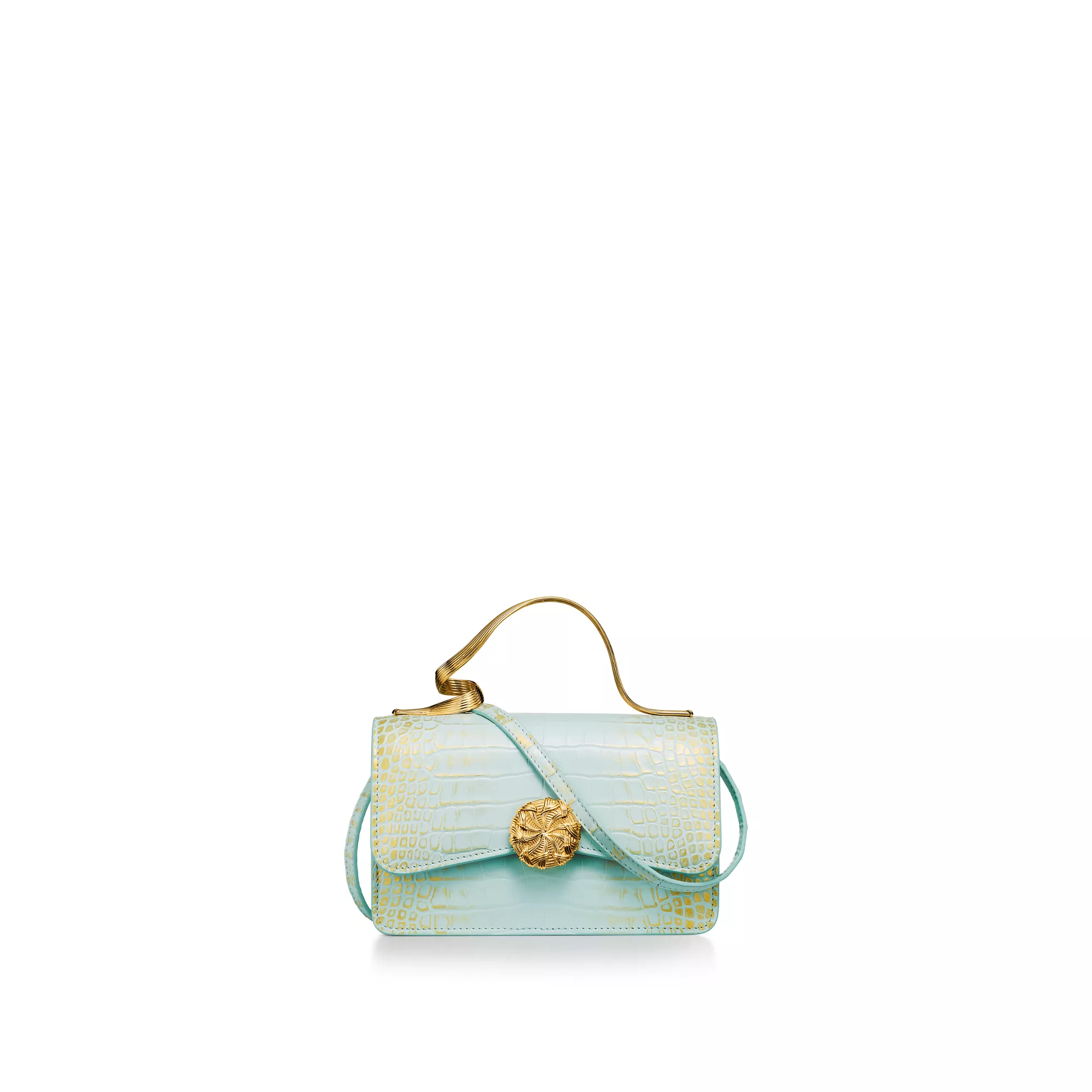 La colección Ribbons de Jean Schlumberger by Tiffany está inspirada en el legado textil de la familia del legendario diseñador y en el detalle ornamental que Schlumberger solía incorporar a sus creaciones. Este bolso de piel de caimán lleva un bolsillo en la parte delantera, forrado de color Tiffany Blue®, y un bolsillo interior en la parte trasera que incluye un espejo extraíble. También cuenta con una correa de piel extraíble. El cierre de latón chapado en oro es un guiño al motivo de una polvera que Jean Schlumberger diseñó en 1957.
