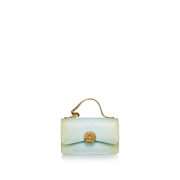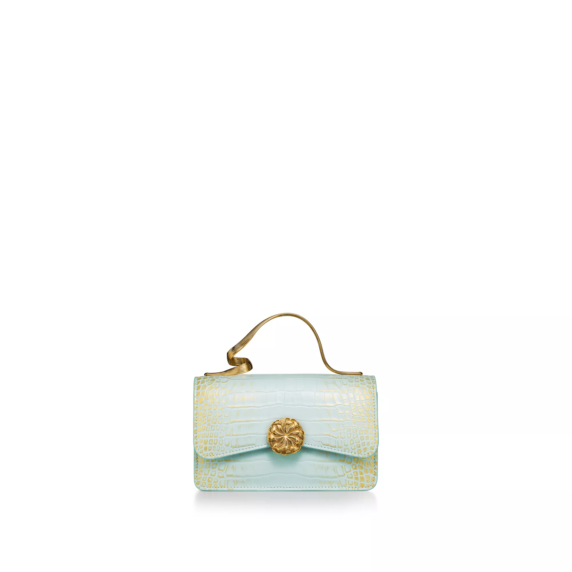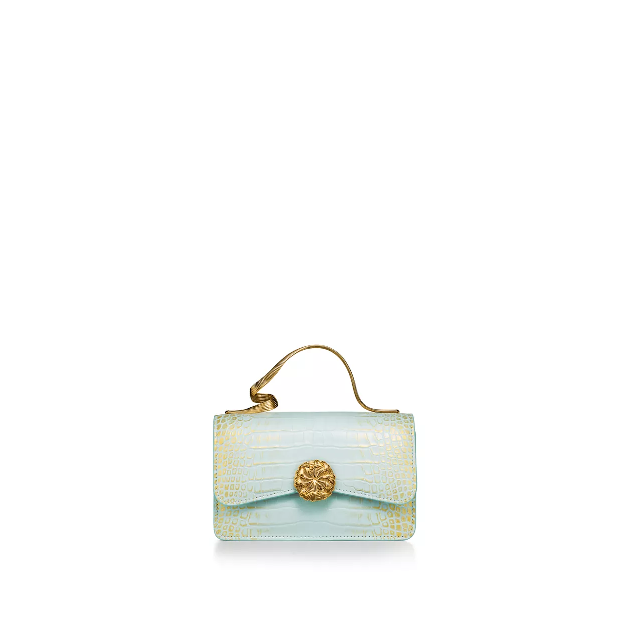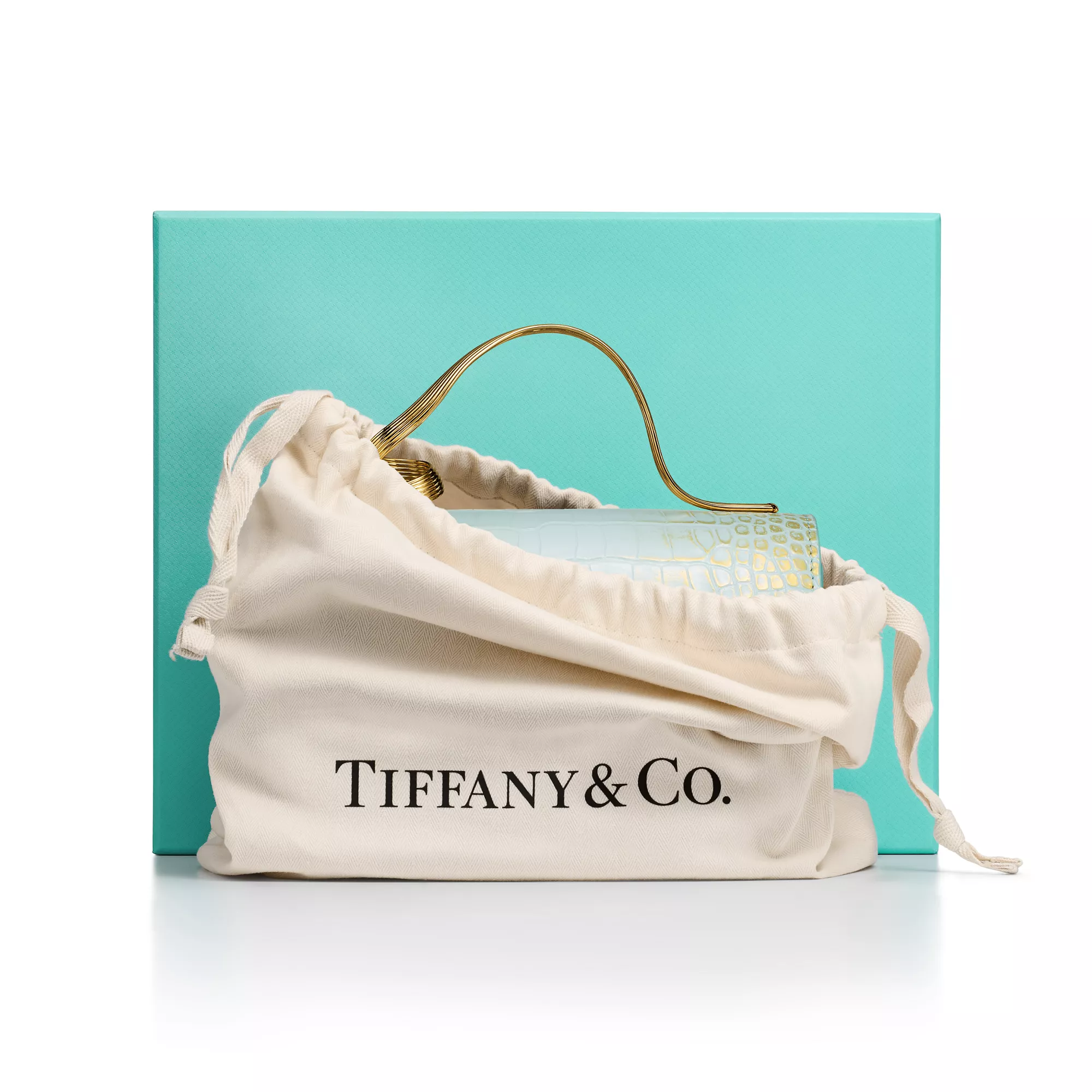 La colección Ribbons de Jean Schlumberger by Tiffany está inspirada en el legado textil de la familia del legendario diseñador y en el detalle ornamental que Schlumberger solía incorporar a sus creaciones. Este bolso de piel de caimán lleva un bolsillo en la parte delantera, forrado de color Tiffany Blue®, y un bolsillo interior en la parte trasera que incluye un espejo extraíble. También cuenta con una correa de piel extraíble. El cierre de latón chapado en oro es un guiño al motivo de una polvera que Jean Schlumberger diseñó en 1957.