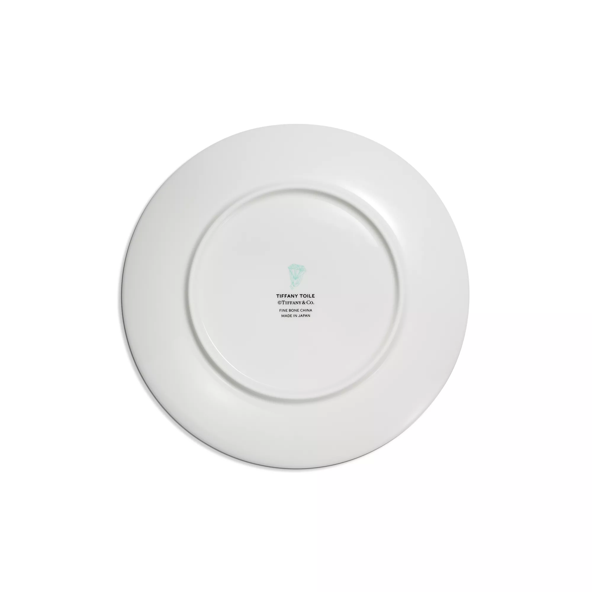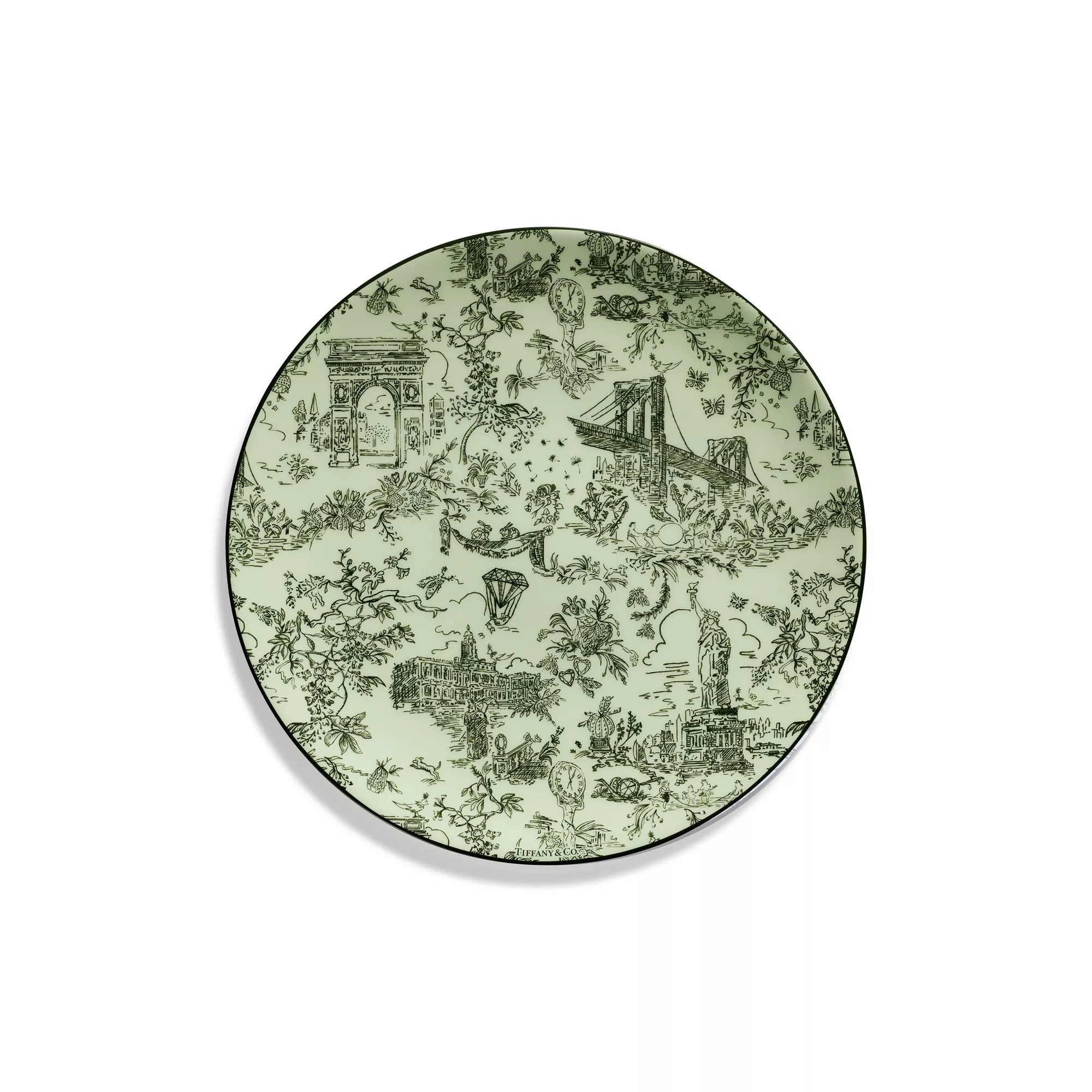 Los diseños Tiffany Toile son un original homenaje a la ciudad natal de Tiffany y su legado. Un diseño alegre y elegante inspirado en ilustraciones de Nueva York procedentes de los Archivos de Tiffany. El puente de Brooklyn junto a nuestro Bird on a Rock y la Estatua de la Libertad compartiendo protagonismo con un diamante de Tiffany & Co. Plato de postre estampado de color tanzanita y borde negro pintado a mano. Para completar su colección, combine este plato con una taza Tiffany Toile.