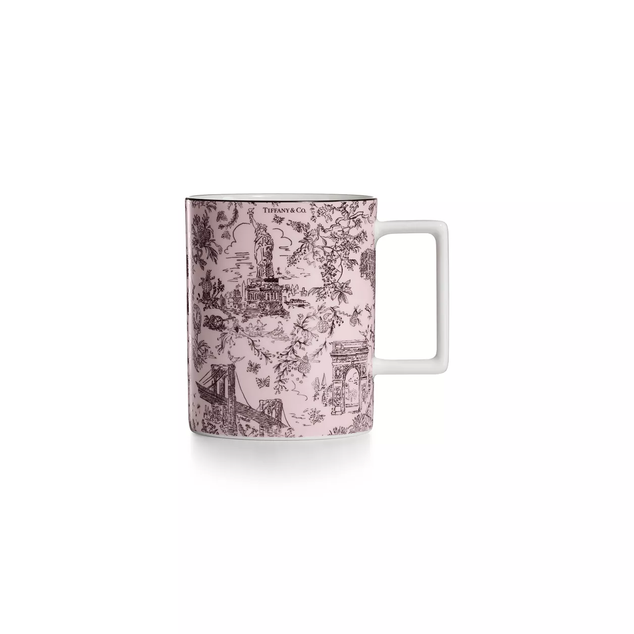Los diseños Tiffany Toile son un original homenaje a la ciudad natal de Tiffany y su legado. Un diseño alegre y elegante inspirado en ilustraciones de Nueva York procedentes de los Archivos de Tiffany. El puente de Brooklyn junto a nuestro Bird on a Rock y la Estatua de la Libertad compartiendo protagonismo con un diamante de Tiffany & Co. Taza estampada de color morganita y borde negro pintado a mano. Combine la taza con un plato de postre Tiffany Toile para crear su propio juego.