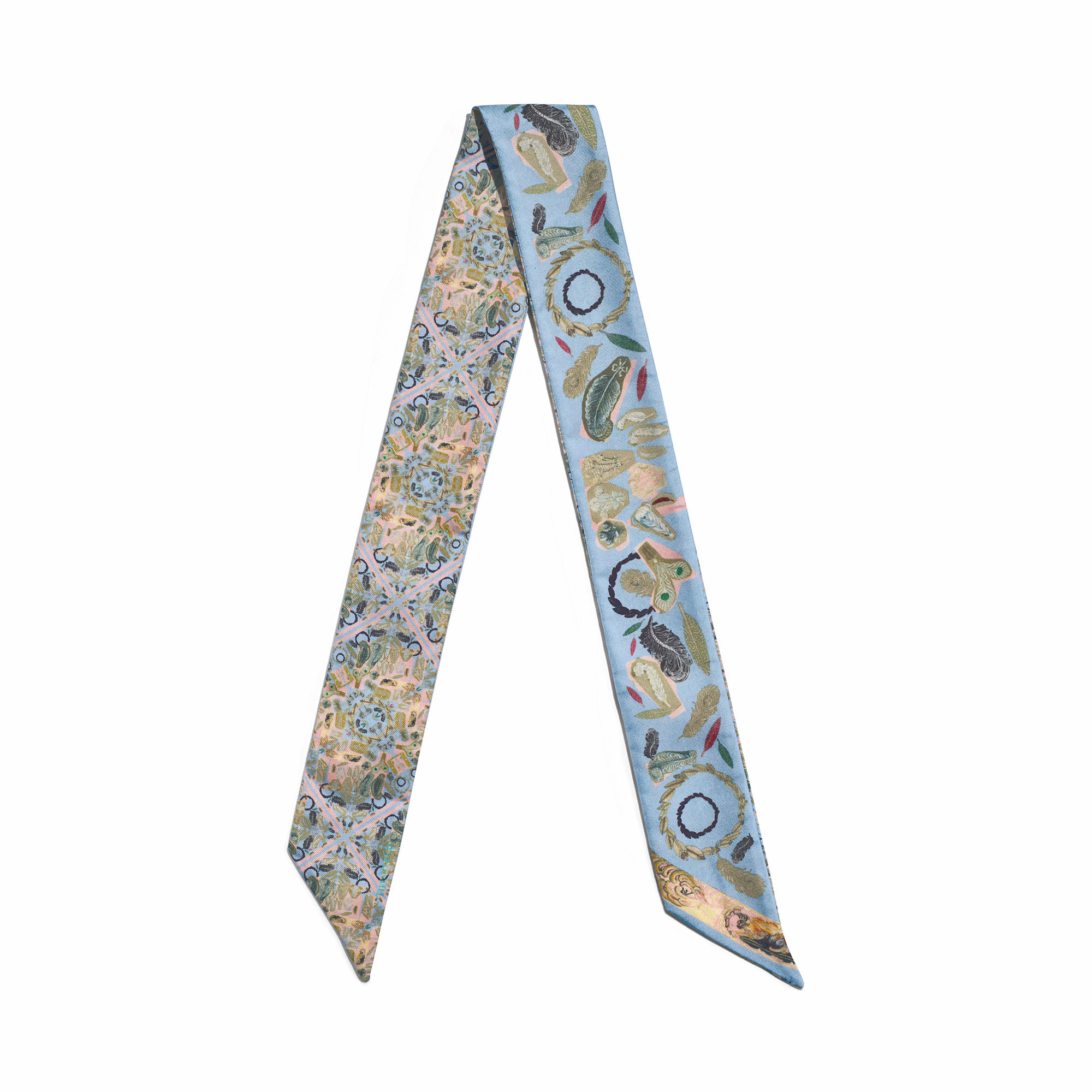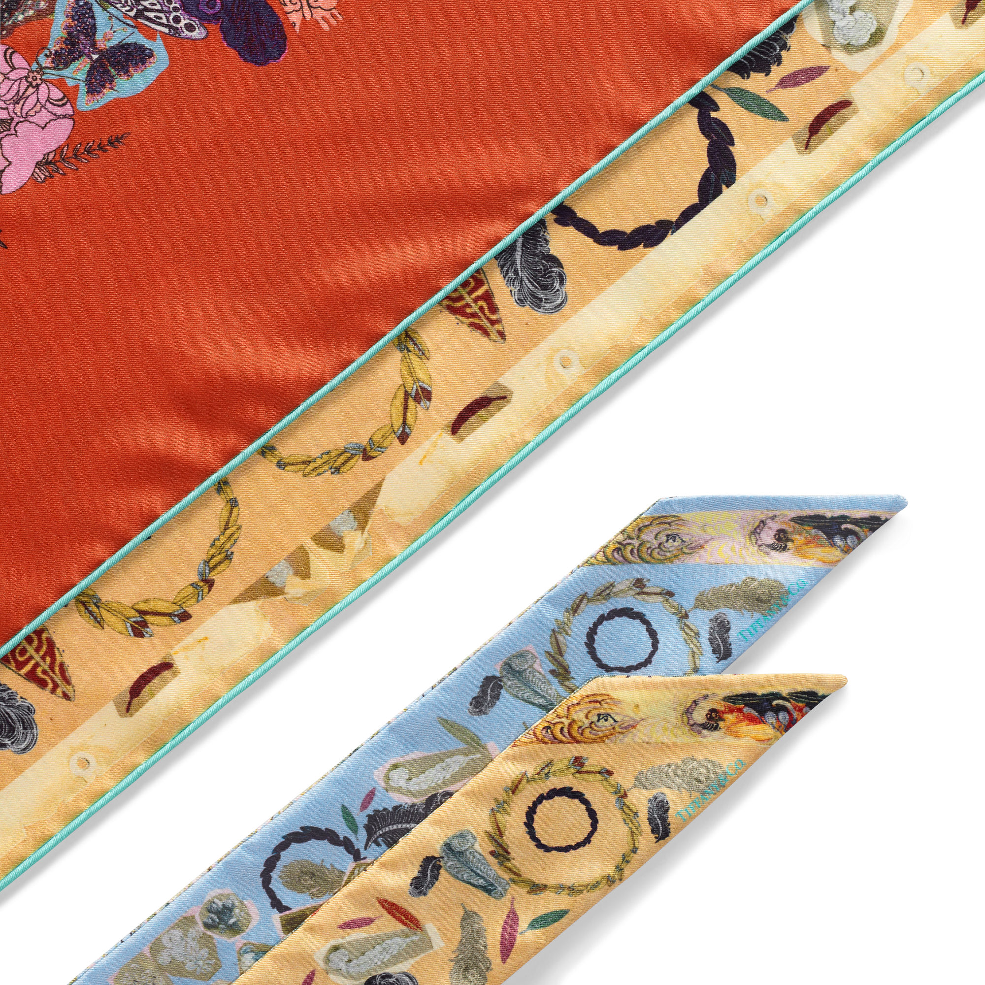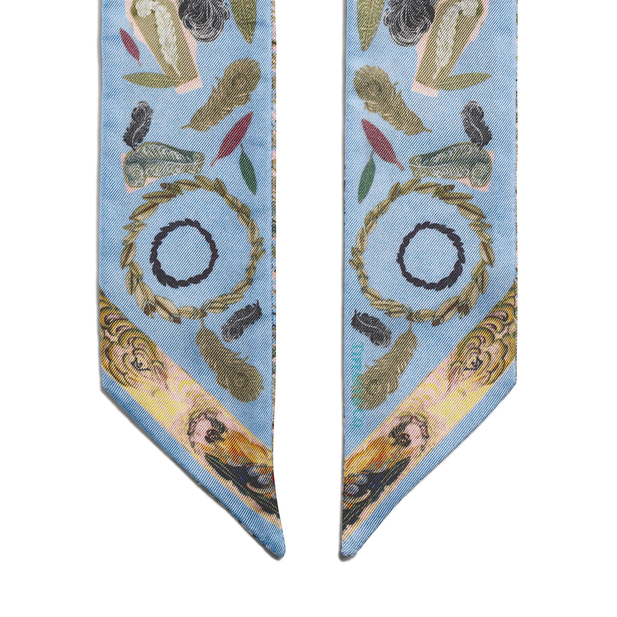 La colección Tiffany Jardin, inspirada en diseños de flora y fauna introducidos por primera vez en la orfebrería de Tiffany & Co. del siglo XIX, capta la belleza del mundo natural. Este pañuelo tipo lazo de doble cara lleva un collage de imágenes de plumas sacadas de los Archivos de Tiffany, dispuestas en dos originales estampados. Está elaborado con seda fina en una paleta de tonos inspirada en el color Tiffany Blue®. Puede conjuntarlo con un pasador de pañuelo de Tiffany o atarlo con estilo a su bolso favorito.