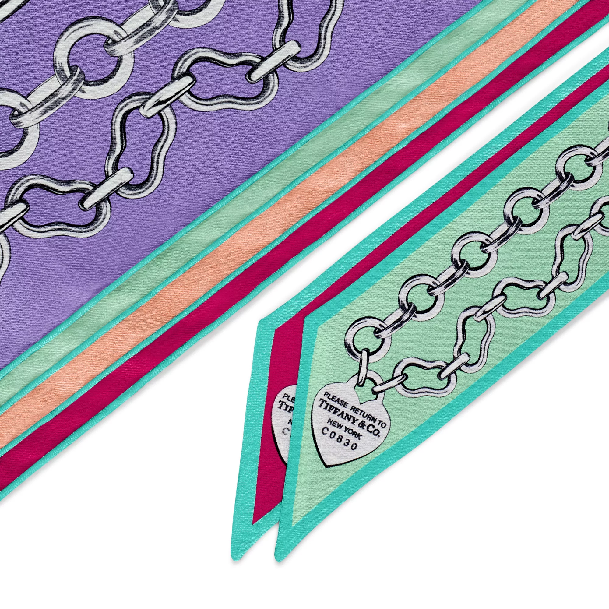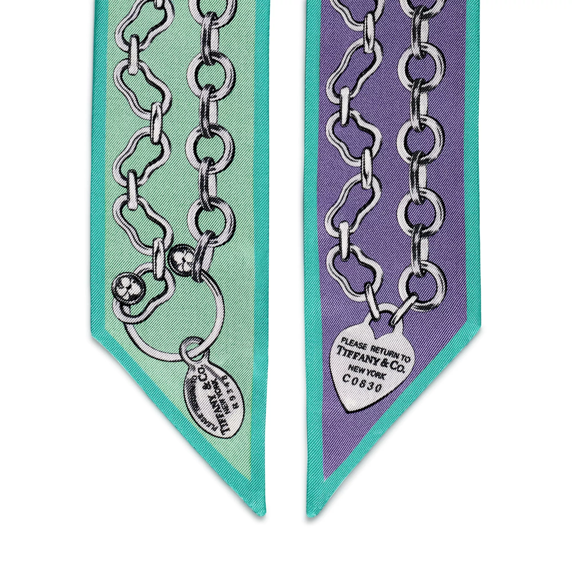 Inspirado en uno de los diseños más distintivos de la marca, el pañuelo de seda Return to Tiffany™ lleva un estampado de cadenas que evocan a nuestras icónicas joyas. Perfecto para llevarlo con un pasador de pañuelo Tiffany o atado en el asa de su bolso Return to Tiffany™ favorito.