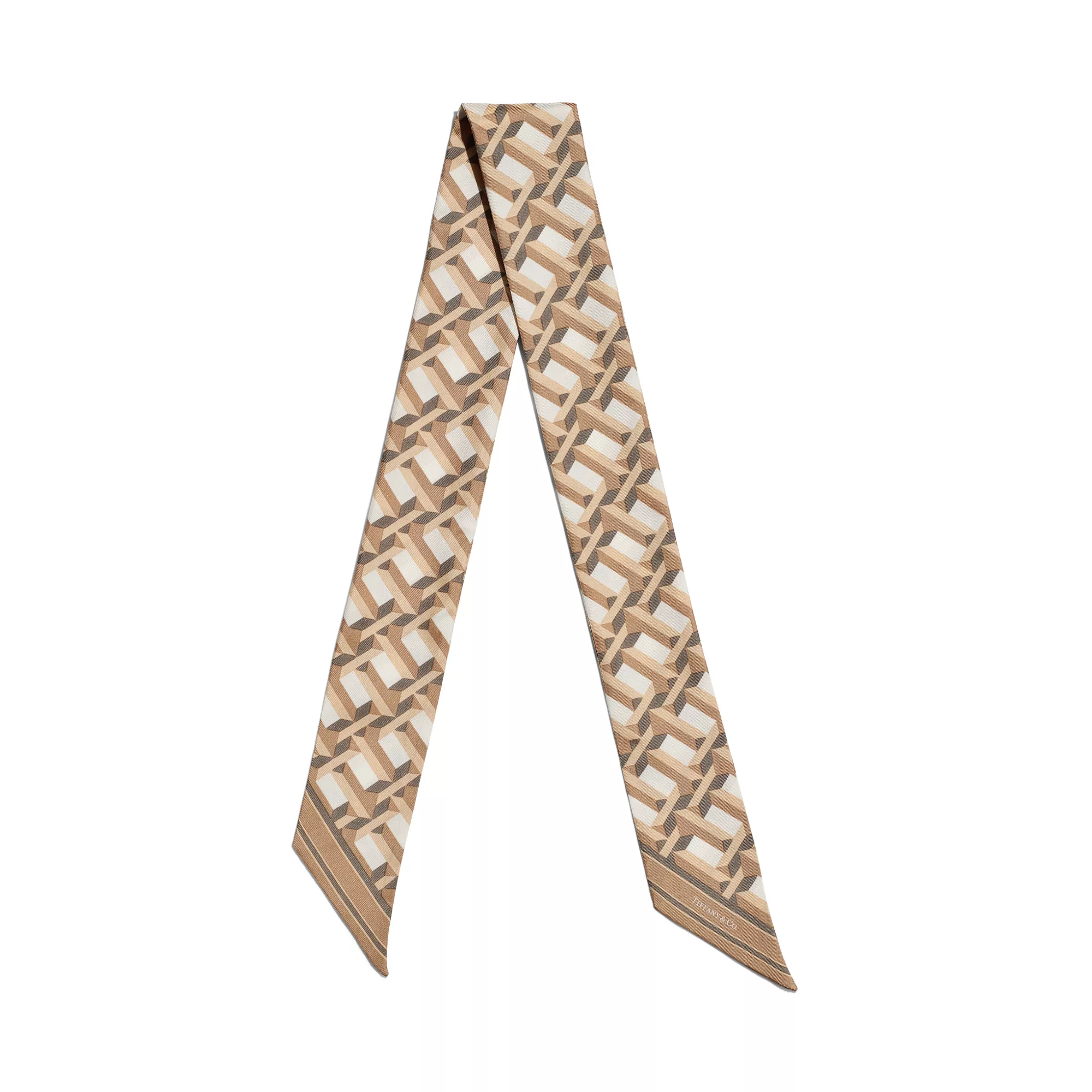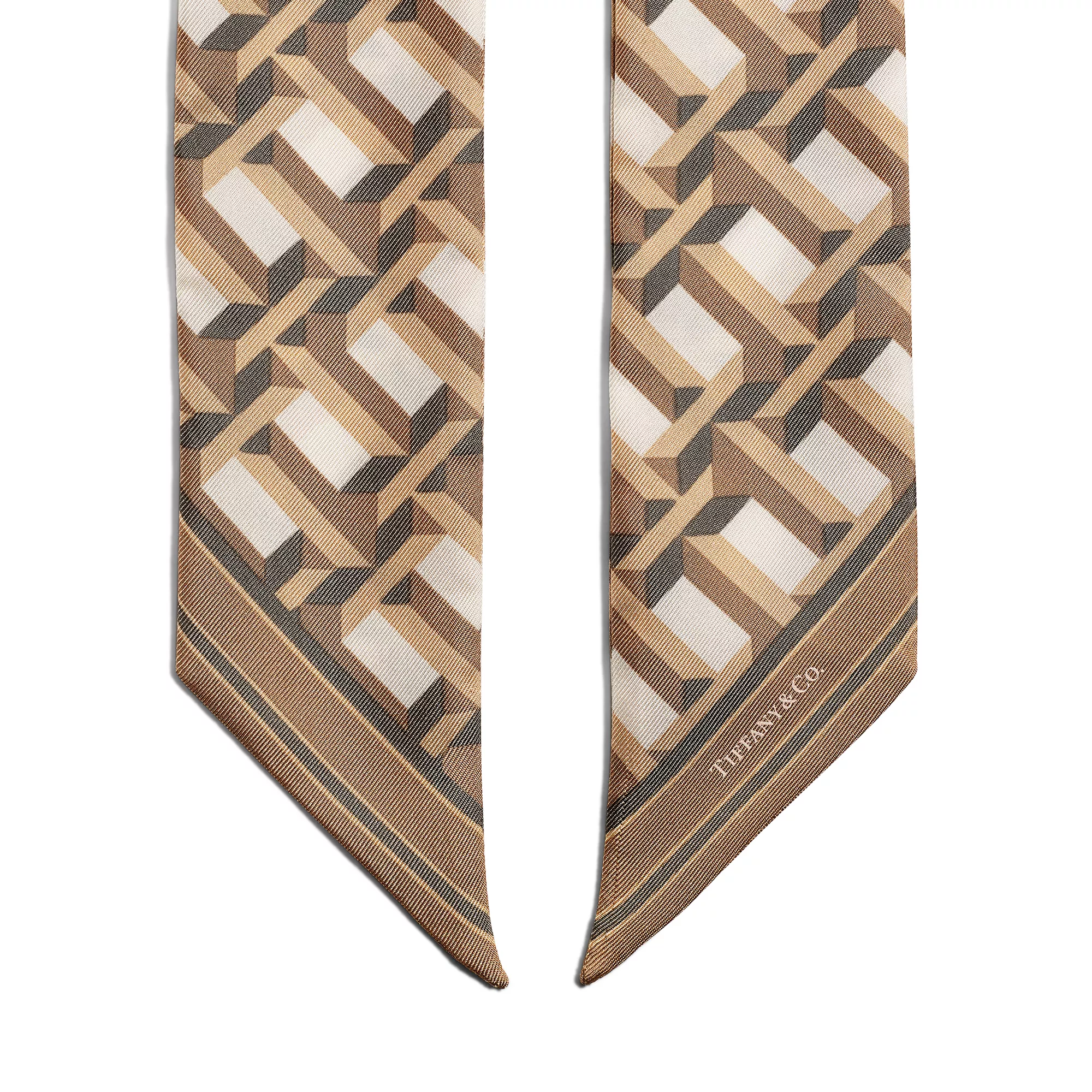 La colección Tiffany T está inspirada en nuestra letra favorita. Pañuelo tipo lazo de seda con un original estampado de letras “T” alternantes en una paleta de tonos beige. Puede conjuntarlo con un pasador de pañuelo de Tiffany o atarlo con estilo a su bolso favorito.
