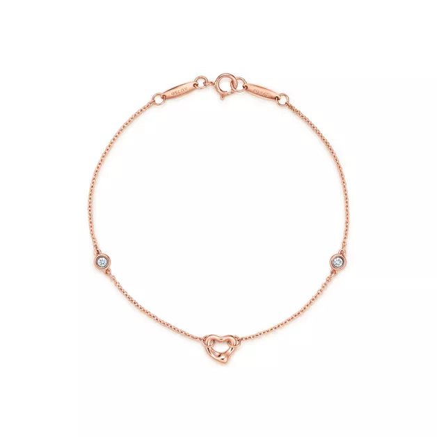 Las formas simples y evocadoras de los diseños Open Heart de Elsa Peretti® celebran el espíritu del amor. Diamantes en talla brillante destacan las hermosas líneas y espacios abiertos del charm en forma de corazón de esta pulsera.