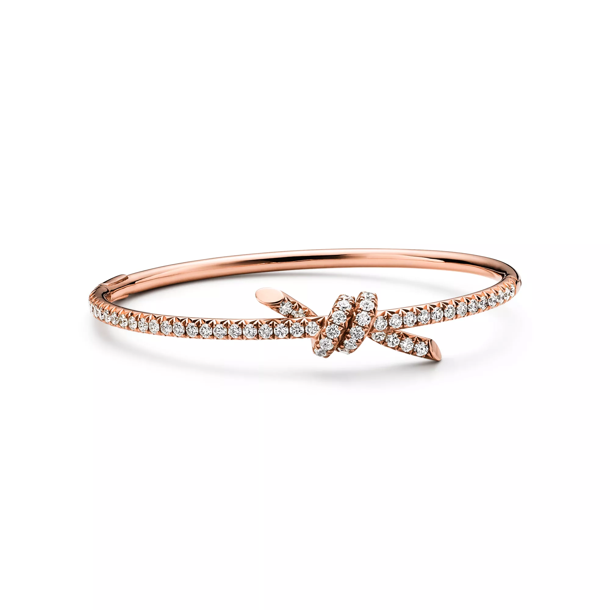Tiffany Knot es una expresión de los lazos inquebrantables del amor. Inspirado en un lazo de archivo diseñado en 1889, el motivo Knot es un símbolo de los vínculos más duraderos y las conexiones más importantes de la vida. Este brazalete está elaborado con oro rosa de 18 quilates pulido a mano para darle un brillo intenso. Cada diamante redondo brillante, seleccionado específicamente para cumplir con los elevados estándares de Tiffany, se engarza a mano en ángulos de manera precisa para maximizar su brillo. Póngase este brazalete solo o combínelo con siluetas clásicas para crear un conjunto inesperado.