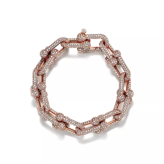 Tiffany HardWear es una expresión de la fuerza transformadora del amor. Inspirada en una pulsera de 1962 encontrada en los archivos de la Casa, HardWear encarna la resistencia perdurable y el espíritu desinhibido. Esta pulsera de oro rosa de 18 quilates presenta los característicos eslabones anchos de la colección en un llamativo contraste entre el metal y los diamantes en pavé. Los artesanos de Tiffany engarzan a mano de manera meticulosa cada diamante para lograr el máximo brillo. El cierre se oculta como un eslabón creando un diseño continuo e ininterrumpido. Este diseño queda de maravilla tanto si lo lleva solo como si lo combina con piezas de otros metales.