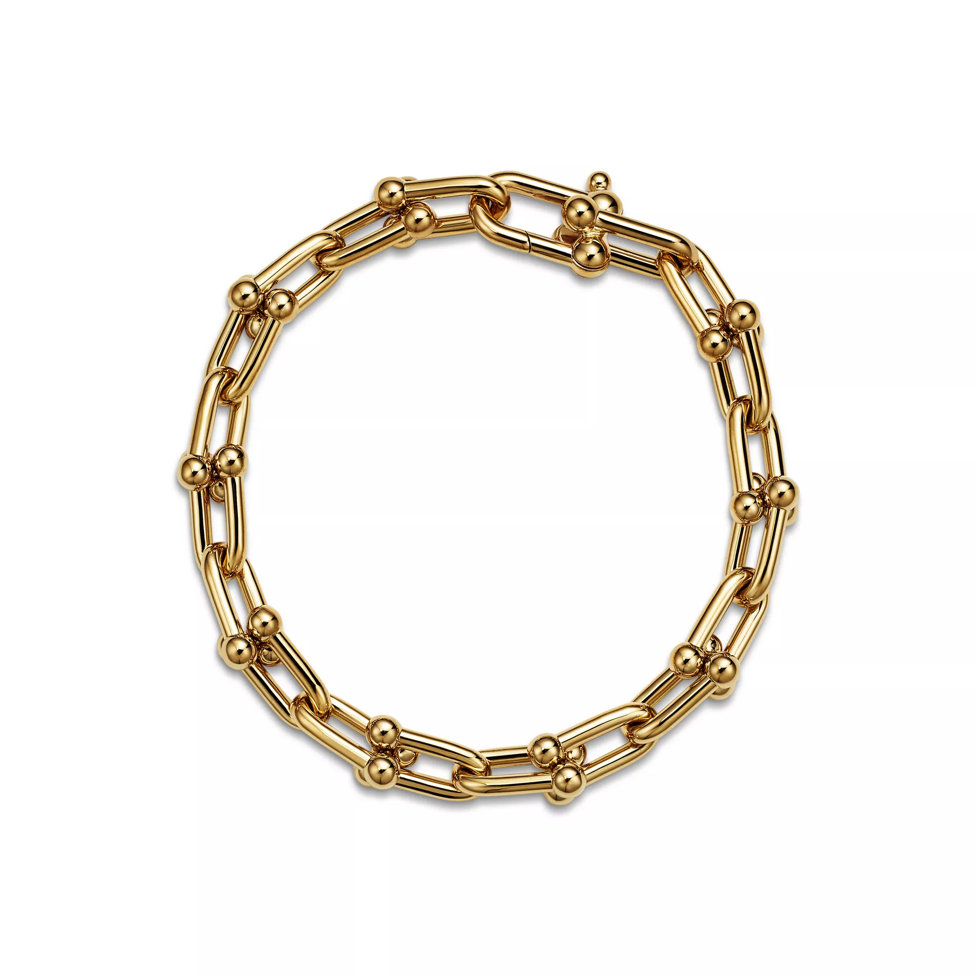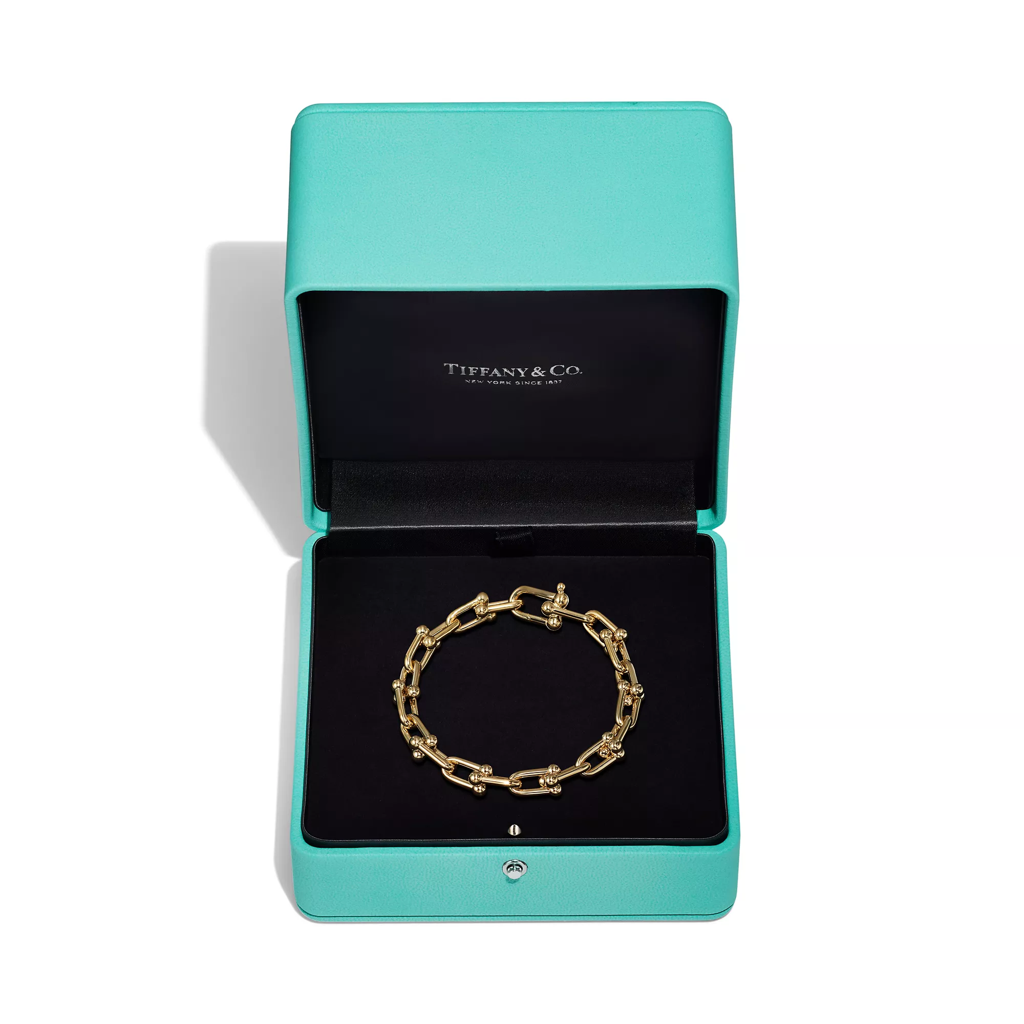 Tiffany HardWear es una expresión de la fuerza transformadora del amor. Inspirada en una pulsera de 1962 encontrada en nuestros archivos, la colección HardWear encarna la resistencia inquebrantable y el espíritu desinhibido. Hoy en día, Tiffany HardWear perpetúa este sentimiento con una colección basada en la libertad y la fuerza que hallamos en el amor. Cada eslabón es una pieza cargada de carácter, que se remata a mano con un delicado equilibrio entre presencia y proporción. A continuación, los eslabones se van uniendo uno a uno hasta formar un elegante diseño. Esta pulsera de oro amarillo de 18 quilates está formada por los emblemáticos eslabones anchos de la colección en tamaño mediano, enlazados en un diseño ininterrumpido. El cierre oculto permite que la pulsera se adapte a la perfección a la muñeca. Si quiere causar sensación, combine esta pulsera con otros diseños HardWear de diferentes tamaños o de metales mixtos para crear un contraste inesperado.