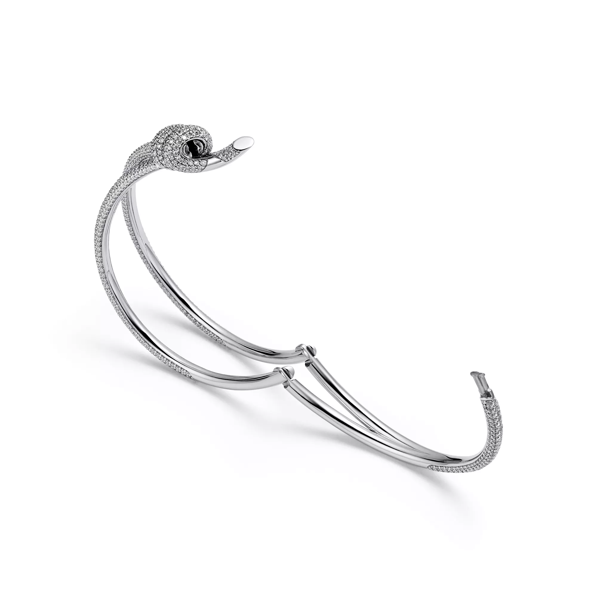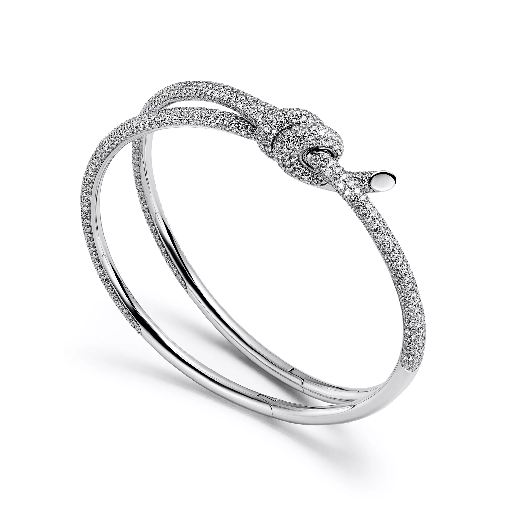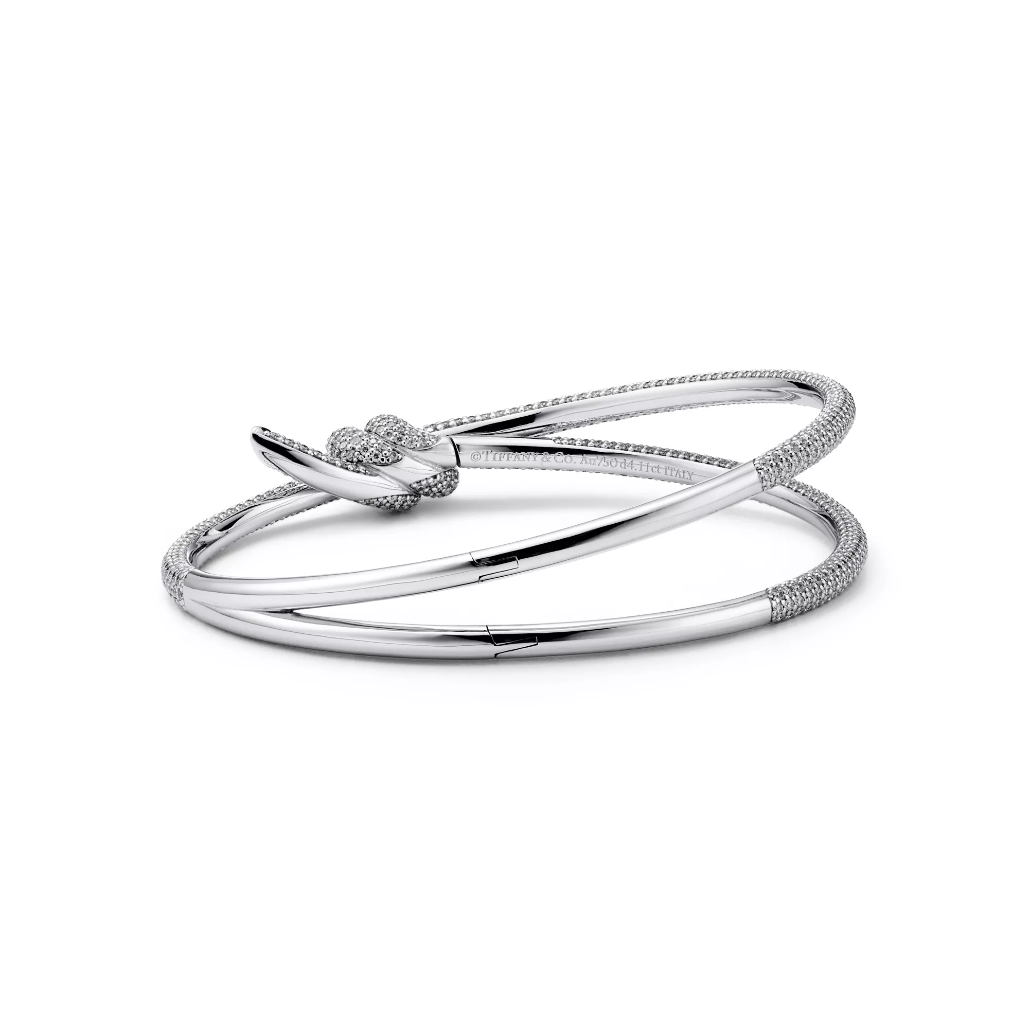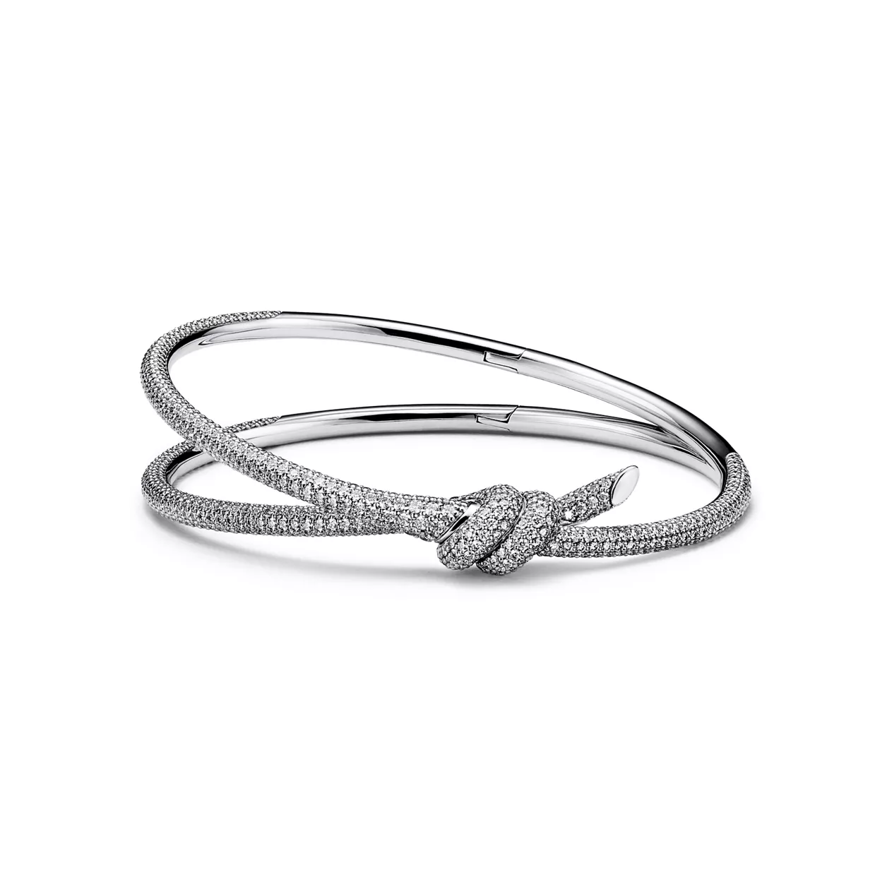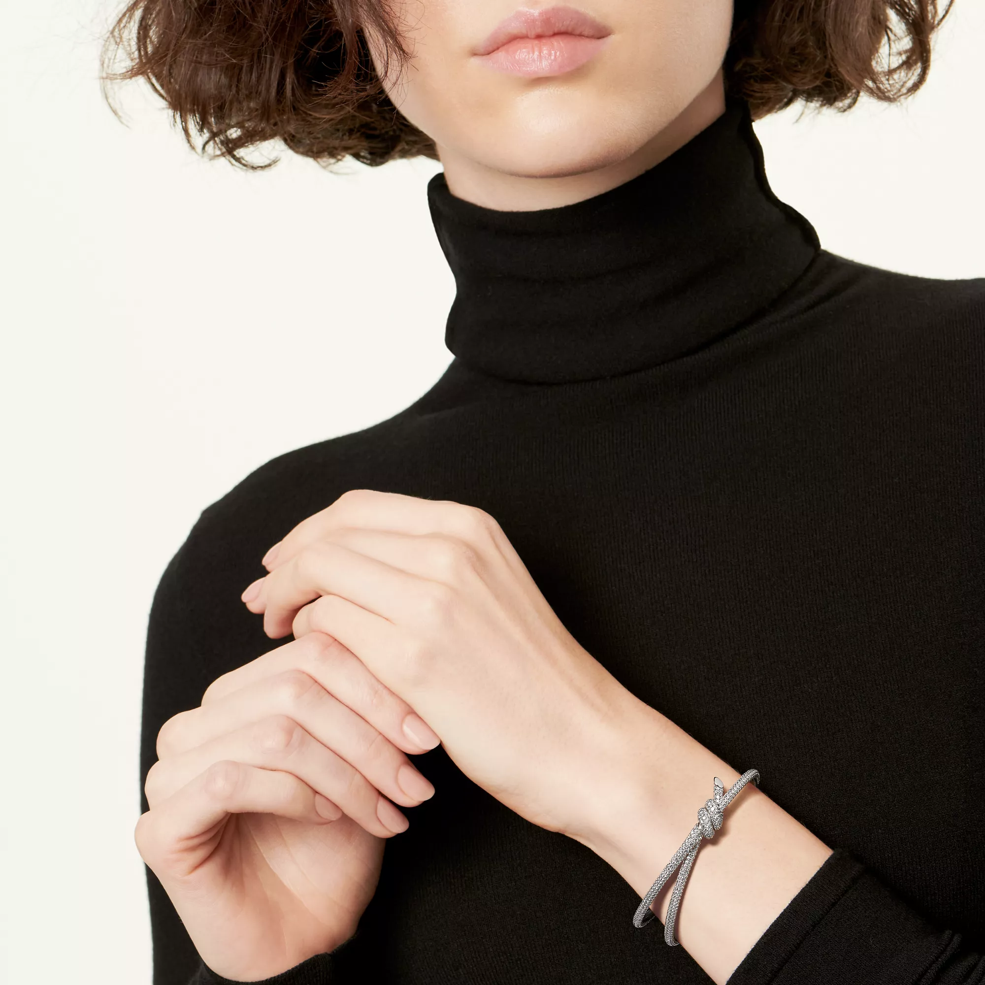Los extremos entrelazados del distintivo motivo de Tiffany Knot simbolizan el poder de las conexiones que hay entre las personas. Con su equilibrio entre fuerza y elegancia, cada diseño Tiffany Knot es una compleja hazaña artesanal. Pulsera realizada en oro blanco y pulida a mano para darle un brillo intenso. Cada diamante redondo brillante, seleccionado específicamente para cumplir con los elevados estándares de Tiffany, se engarza a mano en ángulos de manera precisa para maximizar su brillo. Es perfecta para llevarla sola o combinada con sus pulseras de diario para crear un look más rompedor.