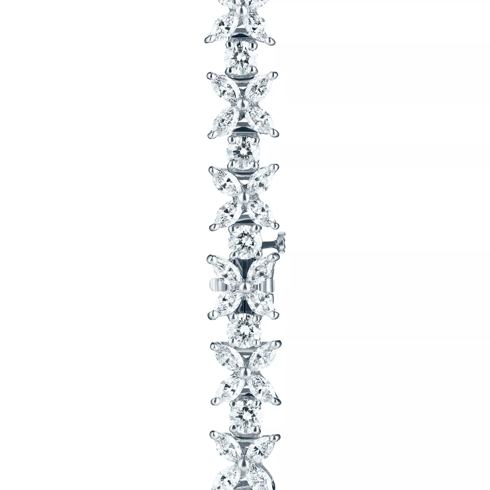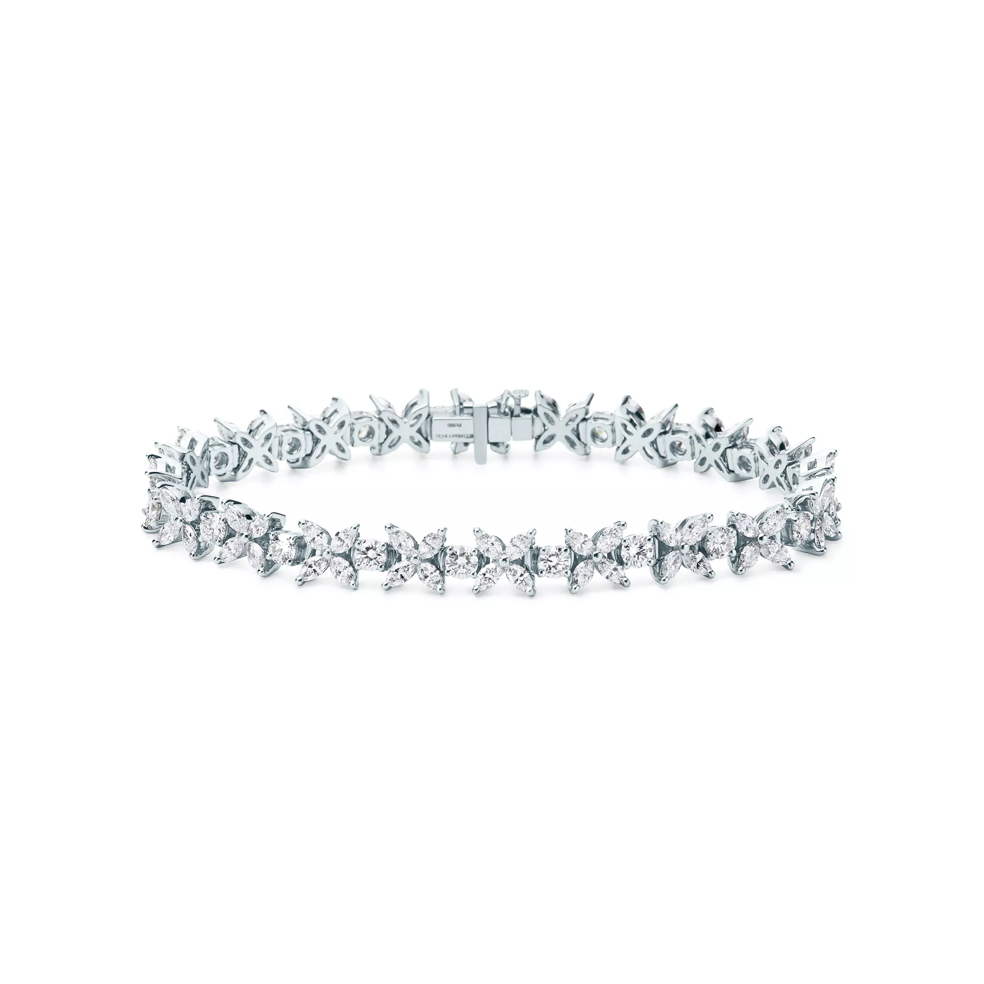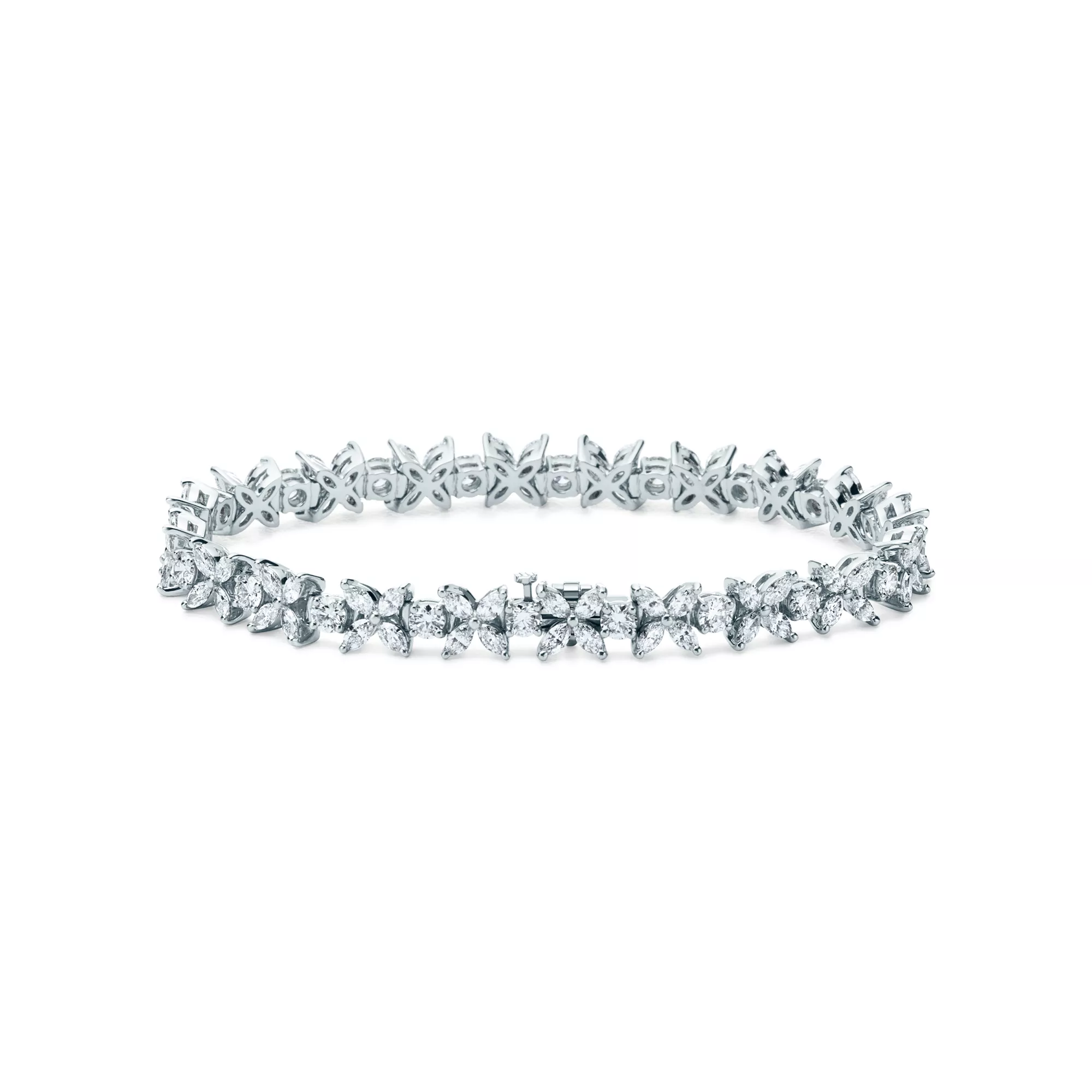 Con la misma intensidad que un cielo estrellado, Tiffany Victoria® homenajea el brillo resplandeciente de los diamantes Tiffany. Una pulsera de infinito resplandor que envuelve la muñeca con elegancia.