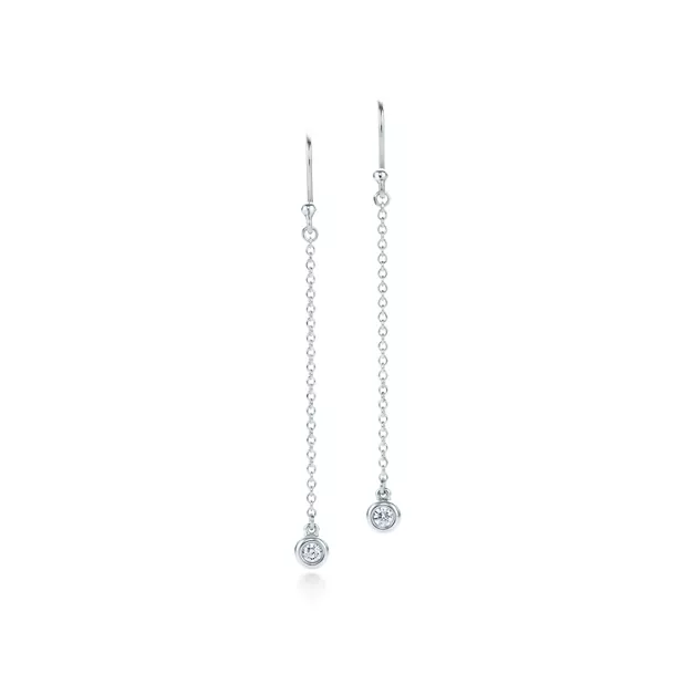 Los diamantes redondos de Tiffany atrapan la luz y la hacen bailar. Pendientes colgantes en plata esterlina con dos brillantes diamantes redondos. Peso total en quilates: 0,10. Diseños originales sujetos a derechos de autor de Elsa Peretti®.