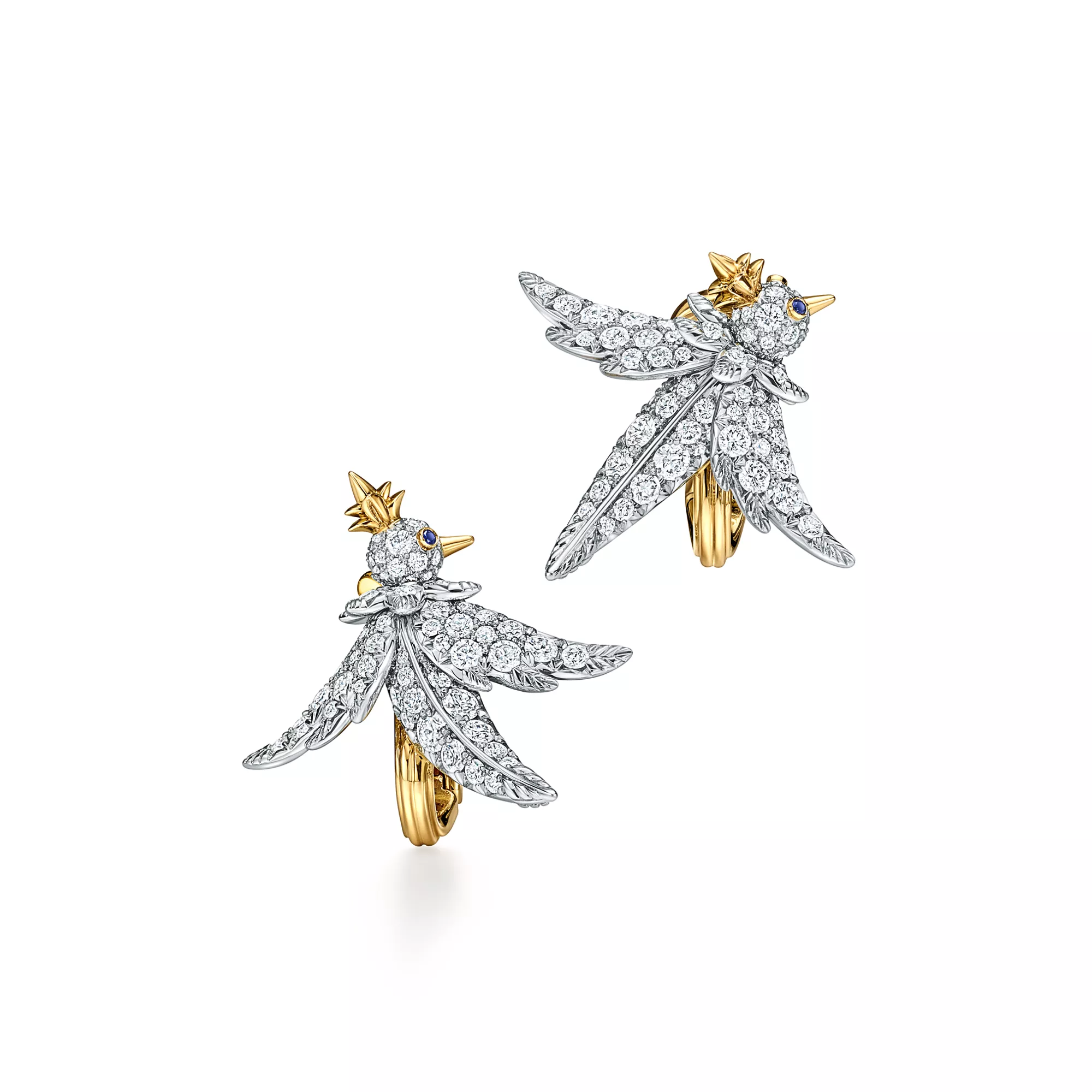 Bird on a Rock by Tiffany es una expresión del optimismo ilimitado del amor. La figura de este pájaro en vuelo simboliza el potencial de la vida, tanto individual como en pareja. Relucientes pendientes de platino y oro amarillo de 18 quilates, adornados con llamativas plumas de estilo escultural, que han sido meticulosamente elaborados usando técnicas especializadas de alta joyería. Cada diseño capta el elegante movimiento que se ve en la naturaleza, representado a través de un delicado equilibrio entre diamantes brillantes y metales preciosos. Todos los pájaros de esta colección están diseñados con diamantes de diferentes tamaños engarzados a mano de manera personalizada: un guiño a las irregularidades naturales que inspiraron las obras maestras originales de Jean Schlumberger.