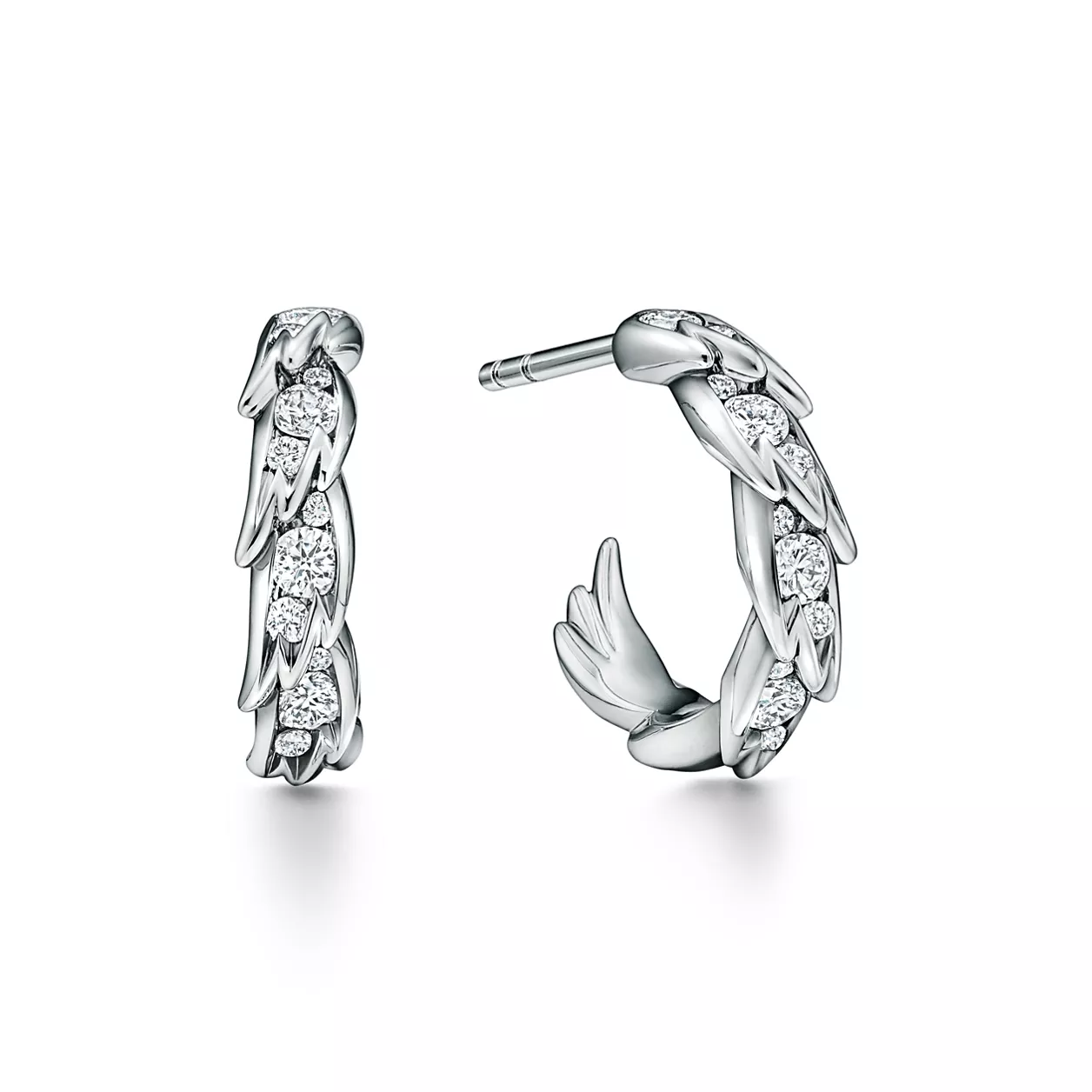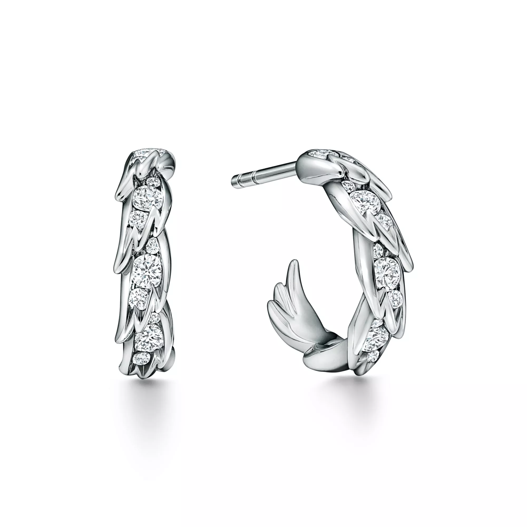 Bird on a Rock by Tiffany es una expresión del optimismo ilimitado del amor. Este motivo abstracto no tiene un engarce visible, lo que resalta la pureza del ala que parece acariciada por el viento. Relucientes pendientes de aro de platino, adornados con llamativas plumas de estilo escultural, que han sido meticulosamente elaborados usando técnicas especializadas de alta joyería. Cada diseño capta el elegante movimiento que se ve en la naturaleza, representado a través de un delicado equilibrio entre diamantes brillantes y metales preciosos. El motivo conserva el arte vanguardista del broche Bird on a Rock original, diseñado por Jean Schlumberger, y lo transforma en creaciones rompedoras y texturizadas.