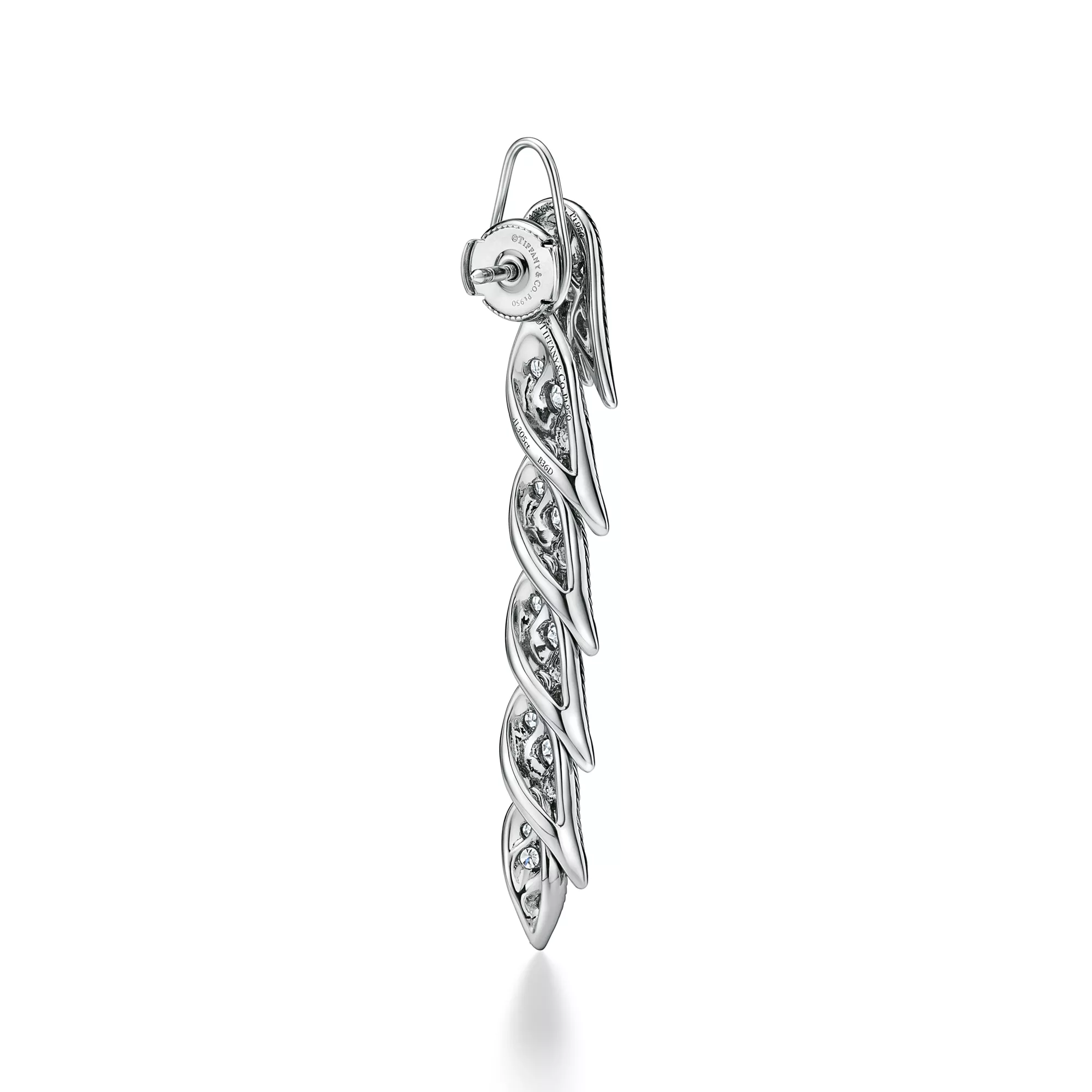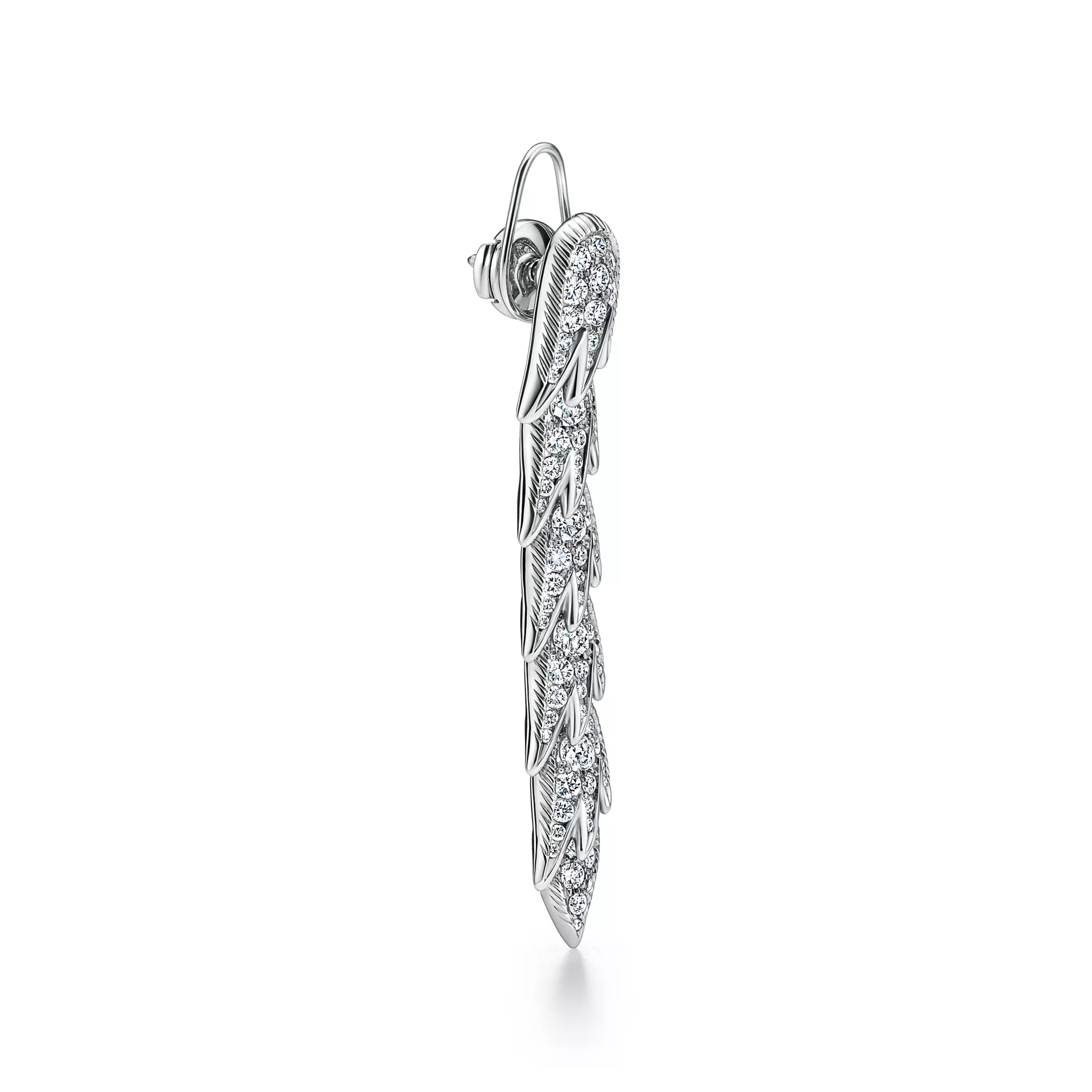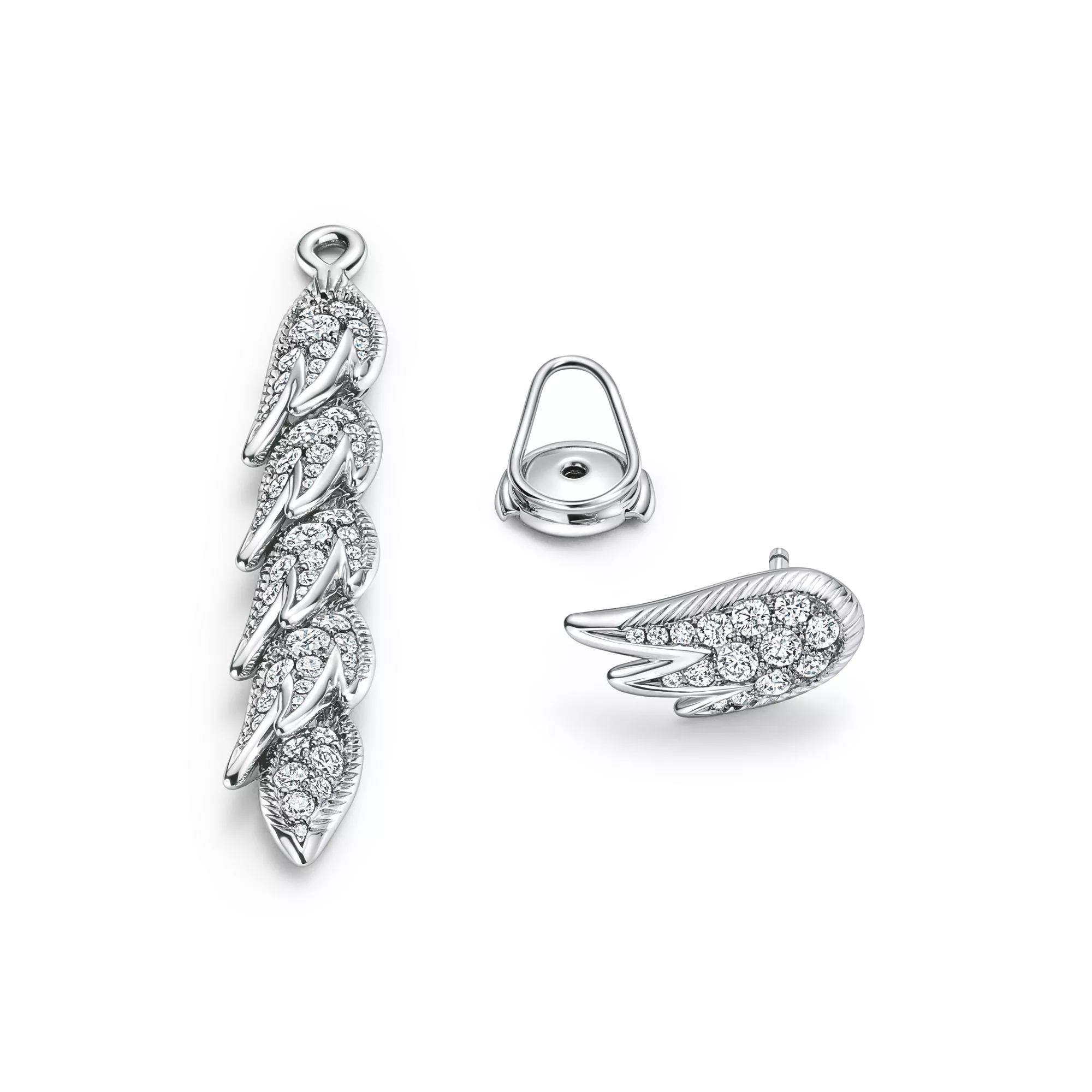 Bird on a Rock by Tiffany es una expresión del optimismo ilimitado del amor. Este motivo abstracto no tiene un engarce visible, lo que resalta la pureza del ala que parece acariciada por el viento. Relucientes pendientes transformables de platino, adornados con llamativas plumas de estilo escultural, que han sido meticulosamente elaborados usando técnicas especializadas de alta joyería. Cada diseño capta el elegante movimiento que se ve en la naturaleza, representado a través de un delicado equilibrio entre diamantes brillantes y metales preciosos. El motivo conserva el arte vanguardista del broche Bird on a Rock original, diseñado por Jean Schlumberger, y lo transforma en creaciones rompedoras y texturizadas.