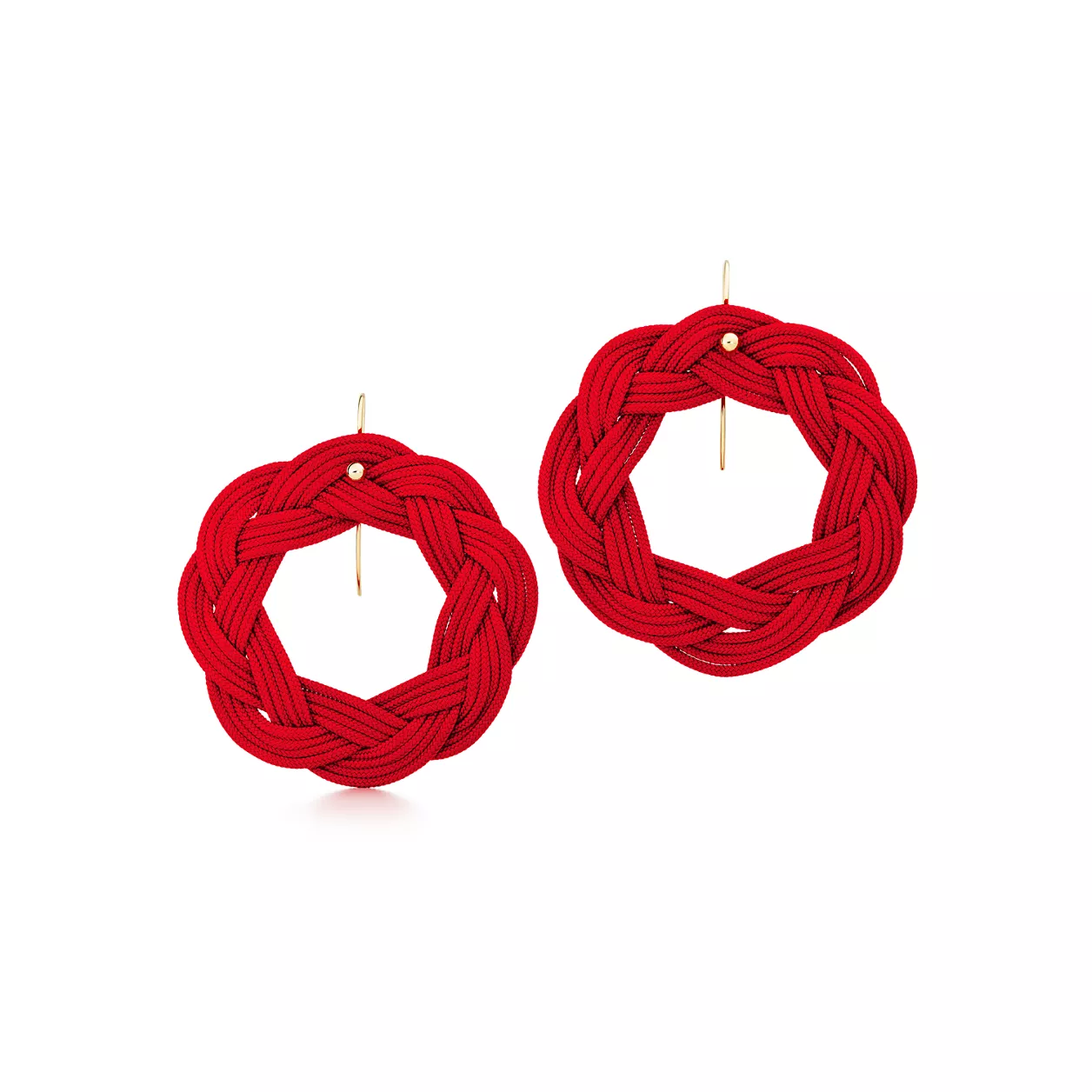 Círculos de seda trenzada entrelazados a mano. Pendientes con cierre de gancho en seda roja trenzada y oro de 18 quilates, para lóbulos perforados. 55 mm de ancho. Diseños originales propiedad de Elsa Peretti®.