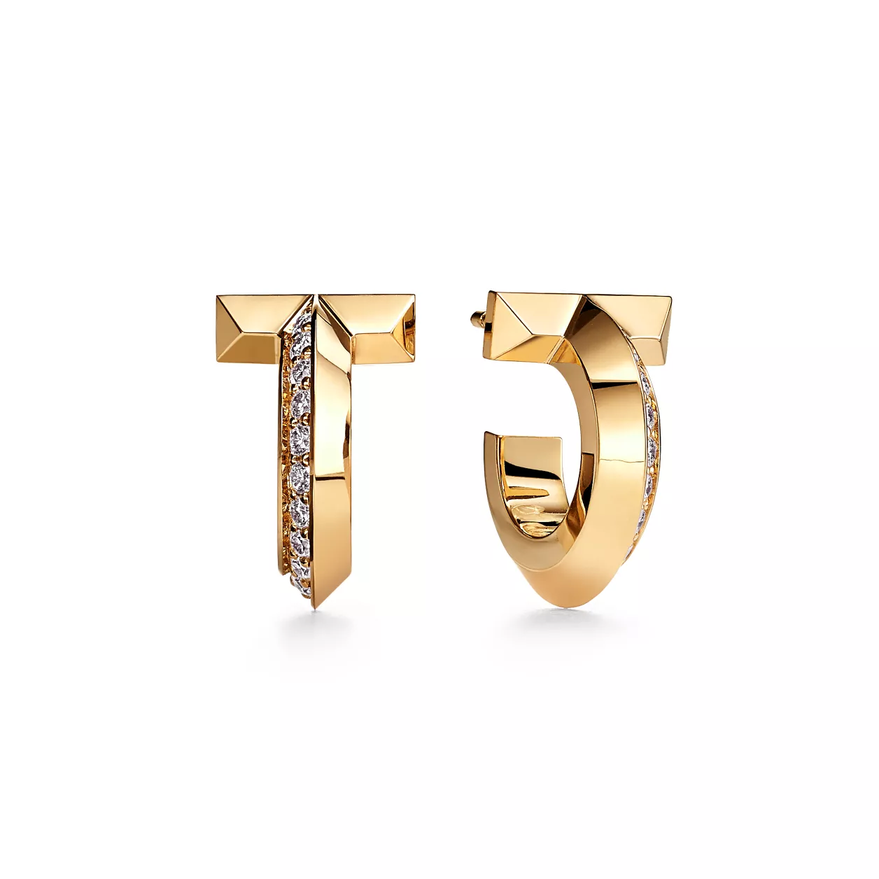 Tiffany T es una expresión del infinito potencial del amor. Inspirada en una pulsera de archivo de 1975, la colección Tiffany T es un homenaje al icónico motivo de la marca y al espíritu de Nueva York, una ciudad que nuestro fundador Charles Lewis Tiffany consideraba un lugar lleno de promesas y oportunidades. Estos pendientes de aro están minuciosamente elaborados de oro amarillo de 18 quilates y tienen un borde biselado trazado con diamantes redondos brillantes. Póngaselos solos como una sorprendente declaración de estilo o combínelos con una mezcla de pendientes de botón para crear un look inesperado.