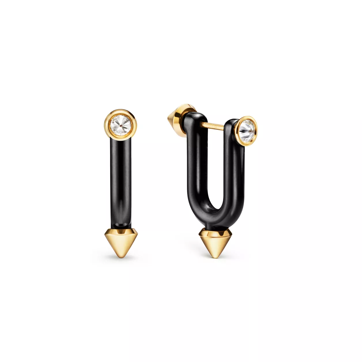Basada en nuestro legado de colaboración con artistas visionarios, la colección Tiffany Titan by Pharrell Williams es una expresión del poder de la rebeldía como catalizador de la creatividad. Estos diseños están inspirados en Poseidón y su tridente. El motivo angular en forma de lanza y los llamativos eslabones contorneados están elaborados con oro de 18 quilates y titanio para crear un espectacular contraste. Los diamantes engarzados del revés y en engastes en pavé tipo cola de pez permiten que la luz los atraviese desde todos los ángulos, realzando así el brillo. Pendientes transformables que se convierten fácilmente en unos pendientes de botón de oro para crear un look nuevo.