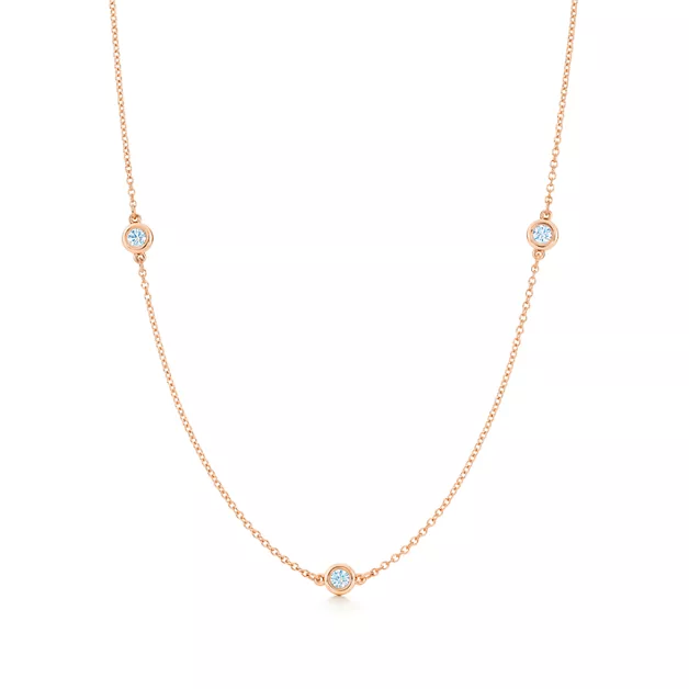 Los diamantes redondos de Tiffany atrapan la luz y la hacen bailar. Collar en oro rosa de 18 quilates con tres brillantes diamantes redondos. 40,6 cm de largo. Peso total en quilates: 0,21. Diseños originales sujetos a derechos de autor de Elsa Peretti®.