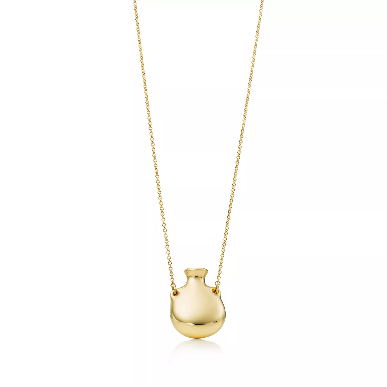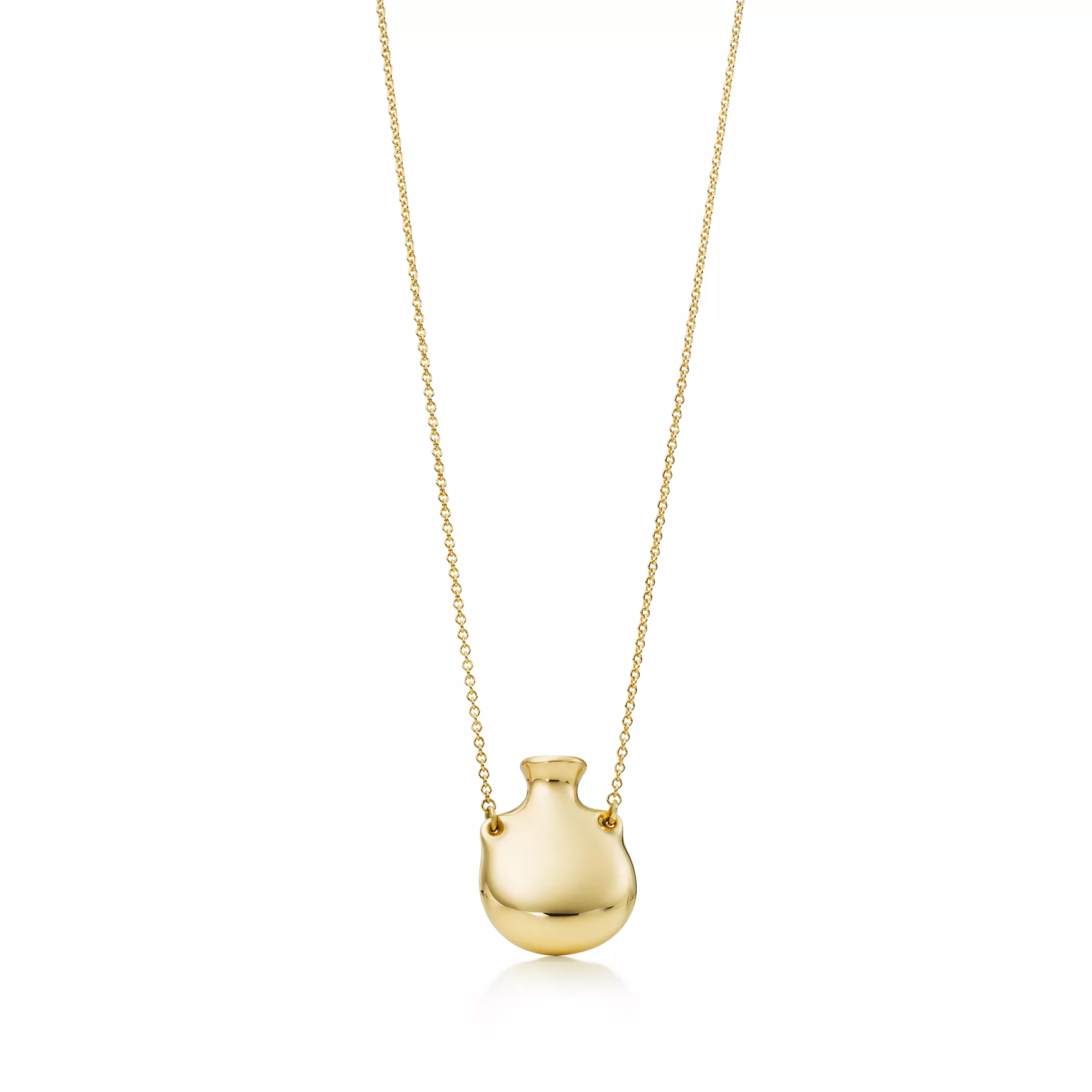 Uno de los primeros diseños de joyería de Elsa Peretti. Colgante en oro de 18 quilates. Tamaño pequeño, en una cadena de 60,9 cm. 29 x 22 mm. La botella está abierta y en ella puede introducirse una flor. Diseños originales sujetos a derechos de autor de Elsa Peretti®.