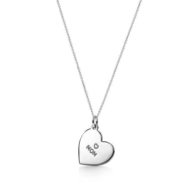 Inspirado en las antiguas etiquetas de precio de Tiffany, este colgante con cadena de plata de ley lleva un charm en forma de corazón con la palabra “Mom” (mamá) grabada. Un precioso regalo para todas las madres y las figuras maternas.