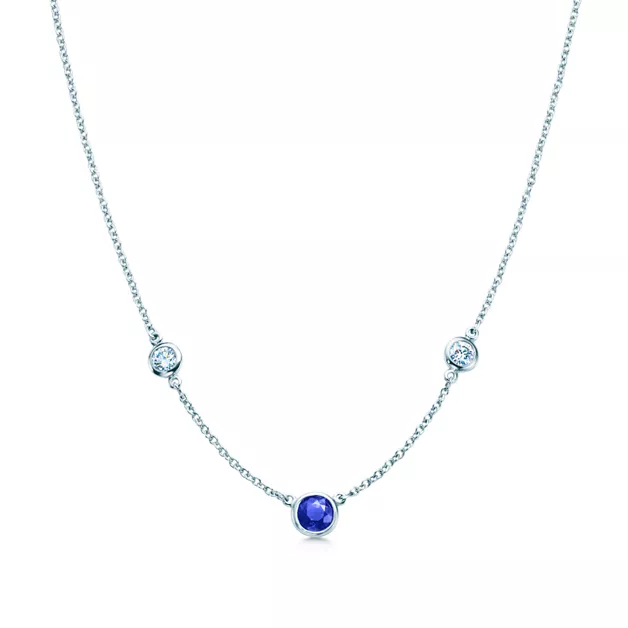 Collar en platino con brillantes diamantes redondos y un zafiro redondo. 40,6 cm de largo. Diamantes con un peso total de 0,16 quilates; zafiro con un peso total de 0,30 quilates. Diseños originales sujetos a derechos de autor de Elsa Peretti®.