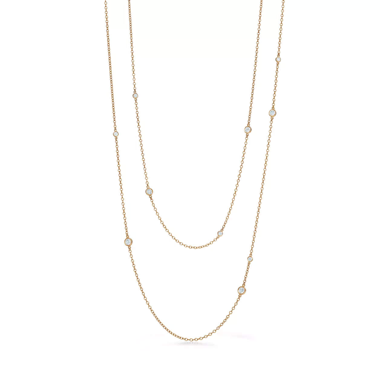 Los diamantes redondos de Tiffany atrapan la luz y la hacen bailar. Collar tipo rocío en oro de 18 quilates con doce brillantes diamantes redondos. 91,4 cm de largo. Peso total en quilates: 1,21. Diseños originales sujetos a derechos de autor de Elsa Peretti®.