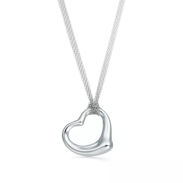 Las formas simples y evocadoras de los diseños Open Heart de Elsa Peretti® celebran el espíritu del amor. Las sencillas curvas de este colgante contrastan a la perfección con su cadena de malla.