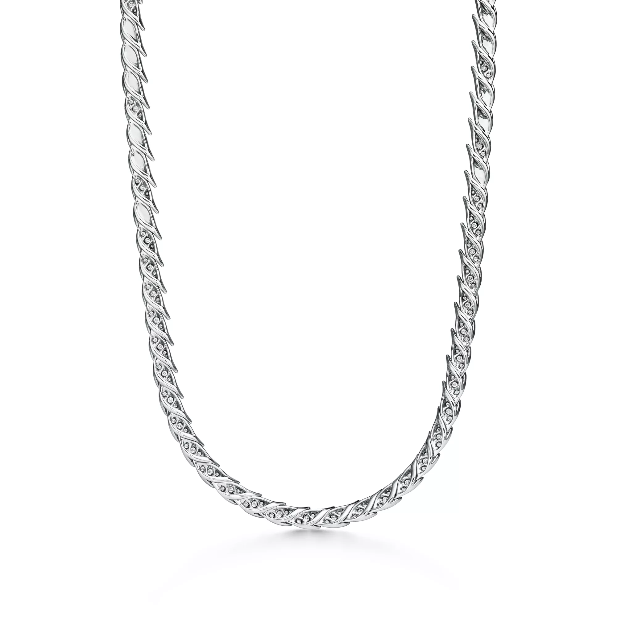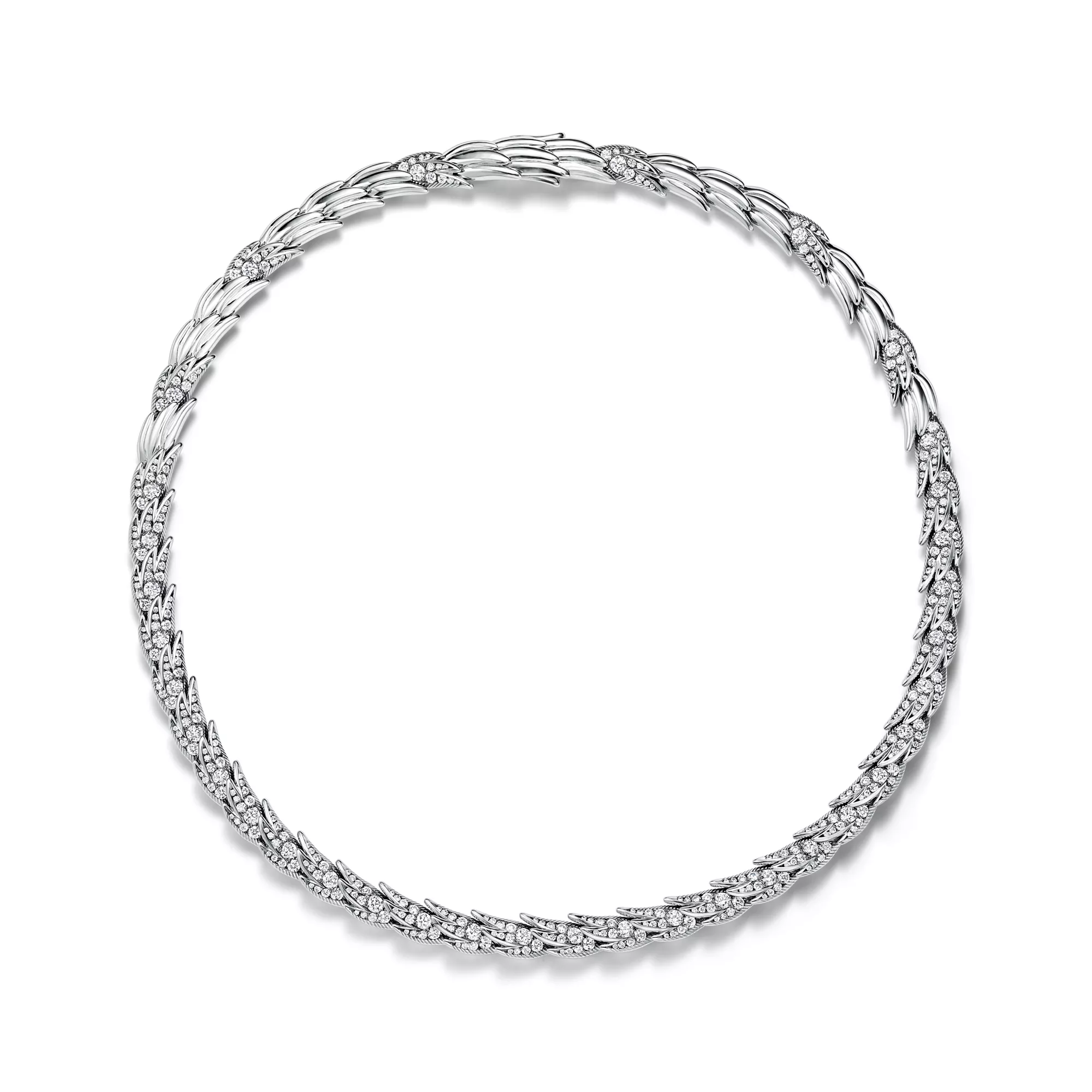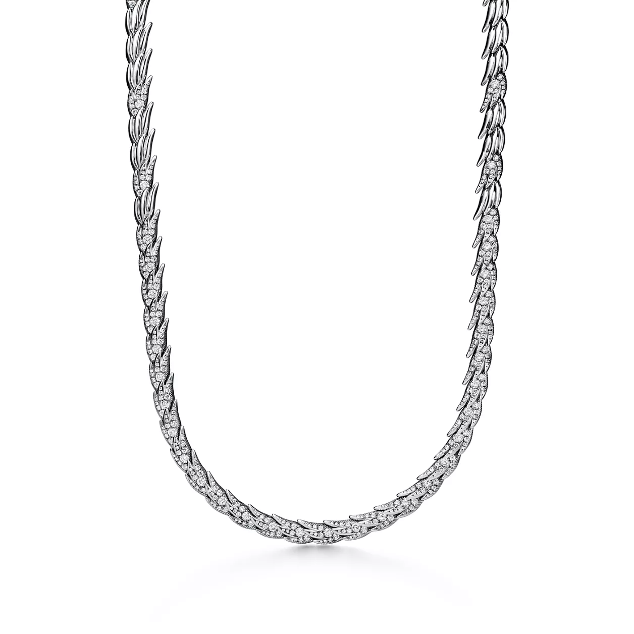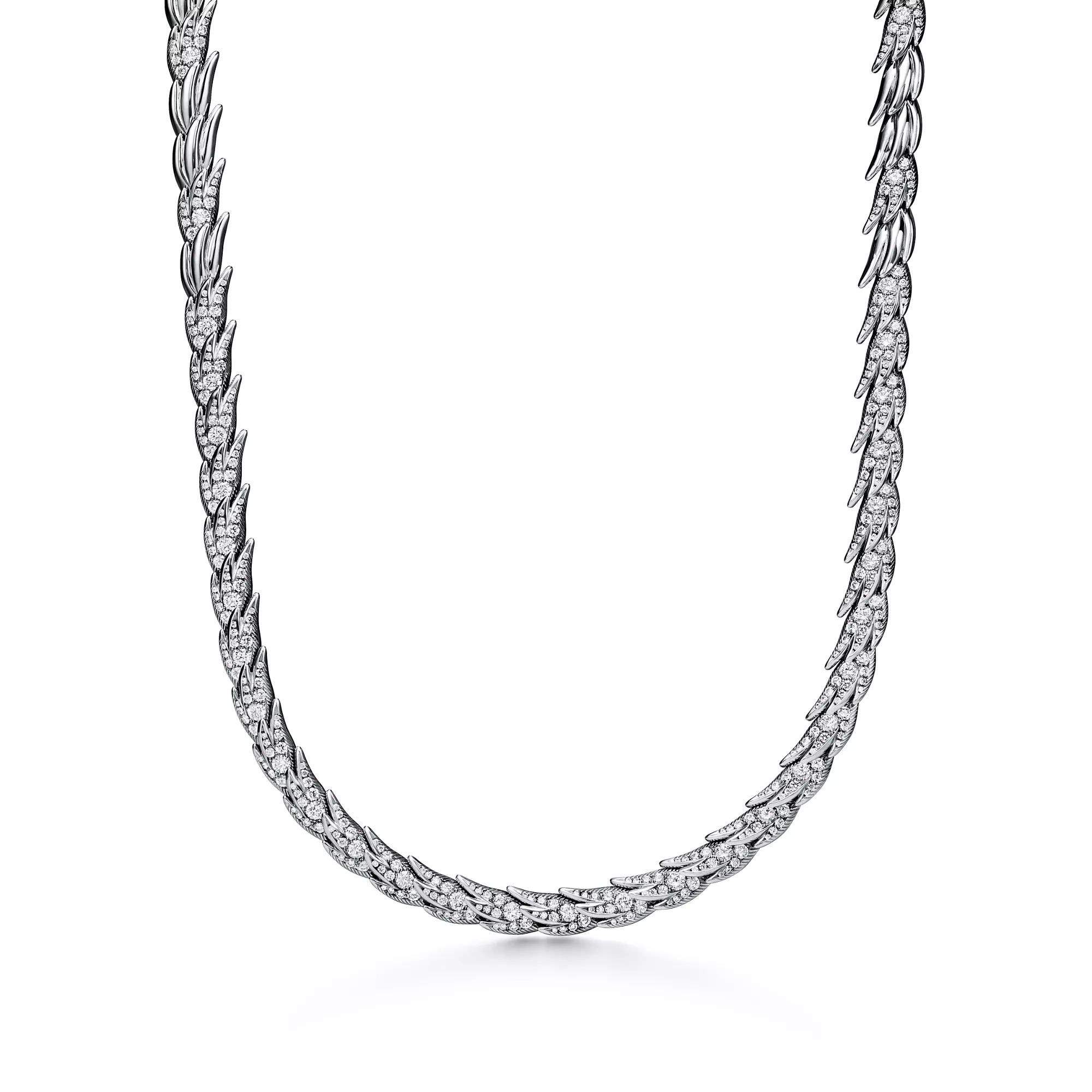 Bird on a Rock by Tiffany es una expresión del optimismo ilimitado del amor. Este motivo abstracto no tiene un engarce visible, lo que resalta la pureza del ala que parece acariciada por el viento. Reluciente collar escalonado de platino, adornado con llamativas plumas de estilo escultural, meticulosamente elaborado usando técnicas especializadas de alta joyería. Cada diseño capta el elegante movimiento que se ve en la naturaleza, representado a través de un delicado equilibrio entre diamantes brillantes y metales preciosos. Si se combinan varias piezas, los bordes de un diseño encajan a la perfección con la silueta en forma de pluma del otro. El motivo conserva el arte vanguardista del broche Bird on a Rock original, diseñado por Jean Schlumberger, y lo transforma en una creación rompedora y texturizada.