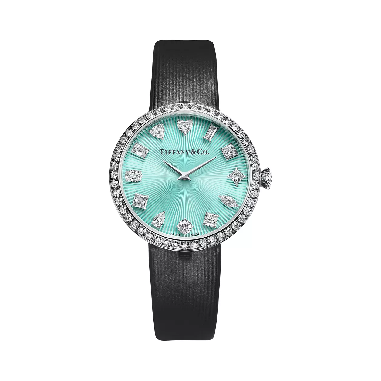 Los relojes Tiffany Eternity nos recuerdan que hay que vivir en el presente. Su esfera está inspirada en una serie de anuncios de publicidad de Tiffany & Co. de 1960 y 1970 y en ella, cada uno de los doce marcadores de hora lo forman diamantes con tallas diferentes: redonda brillante, baguette, cojín, Tiffany True®, marquesa, Asscher, corazón, pera, ovalada, esmeralda, triangular y princesa. La corona del reloj está inspirada en el anillo de compromiso Tiffany® Setting y adopta su icónico engarce de seis garras: un precioso complemento para el halo de diamantes redondos brillantes que rodea la caja. Este reloj de oro blanco cuenta con una correa color carbón de piel de becerro cepillada, rematada con una hebilla de oro blanco con diamantes engarzados. Esta espectacular muestra de artesanía honra nuestro legado de ofrecer los mejores diamantes del mundo, antes, ahora y siempre.